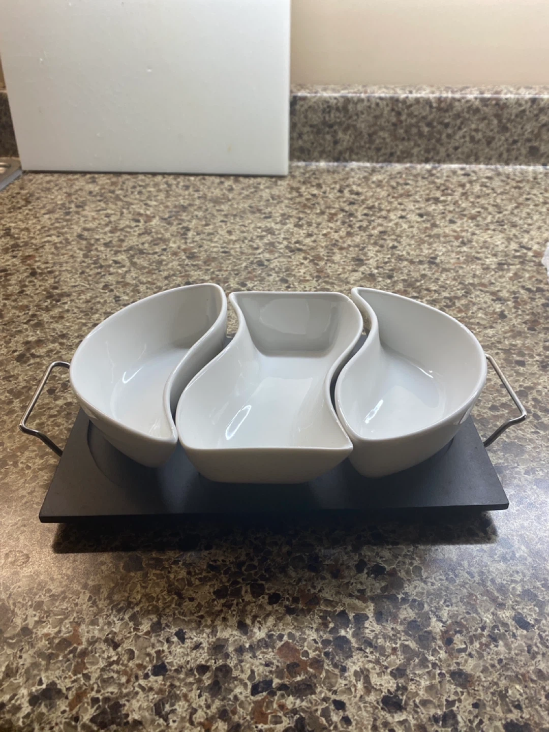 Selling a brand new 3-part server! This elegant server is perfect for entertaining or adding a touch of sophistication to your dining table. It's in pristine condition and ready to be used. The set includes three beautifully shaped bowls arranged on a sleek, black stand. It's a stylish way to serve snacks, appetizers, or condiments