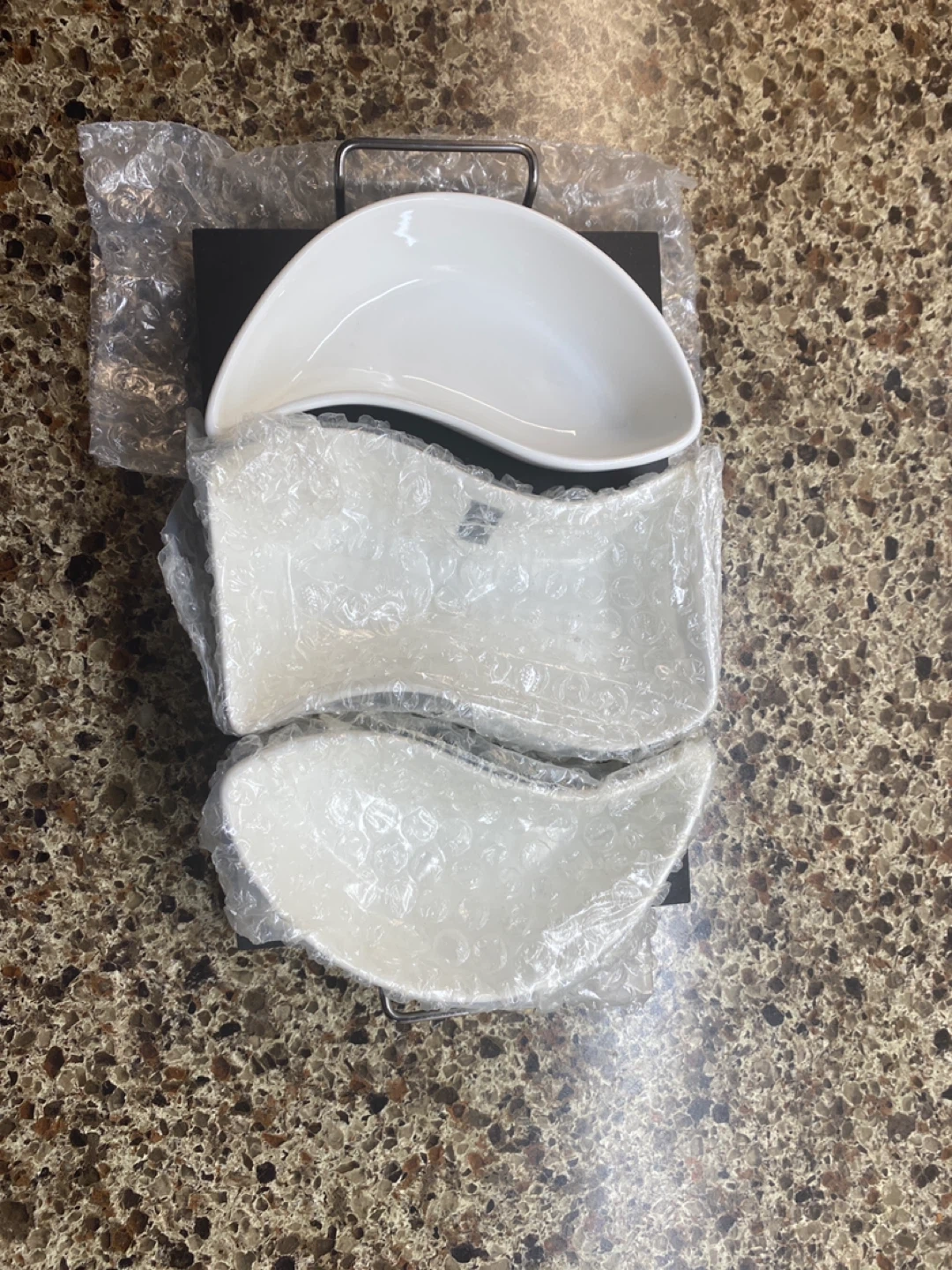 Selling a brand new 3-part server! This elegant server is perfect for entertaining or adding a touch of sophistication to your dining table. It's in pristine condition and ready to be used. The set includes three beautifully shaped bowls arranged on a sleek, black stand. It's a stylish way to serve snacks, appetizers, or condiments
