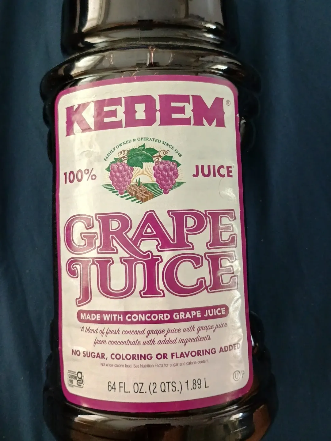 Kedem 100% Grape Juice made with concord grapes. It contains no sugar, coloring, or flavoring added. This bottle is 64 fl. oz. (2 quarts) or 1.89 L.