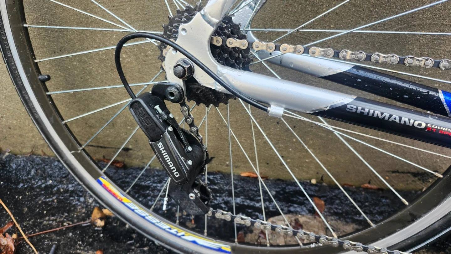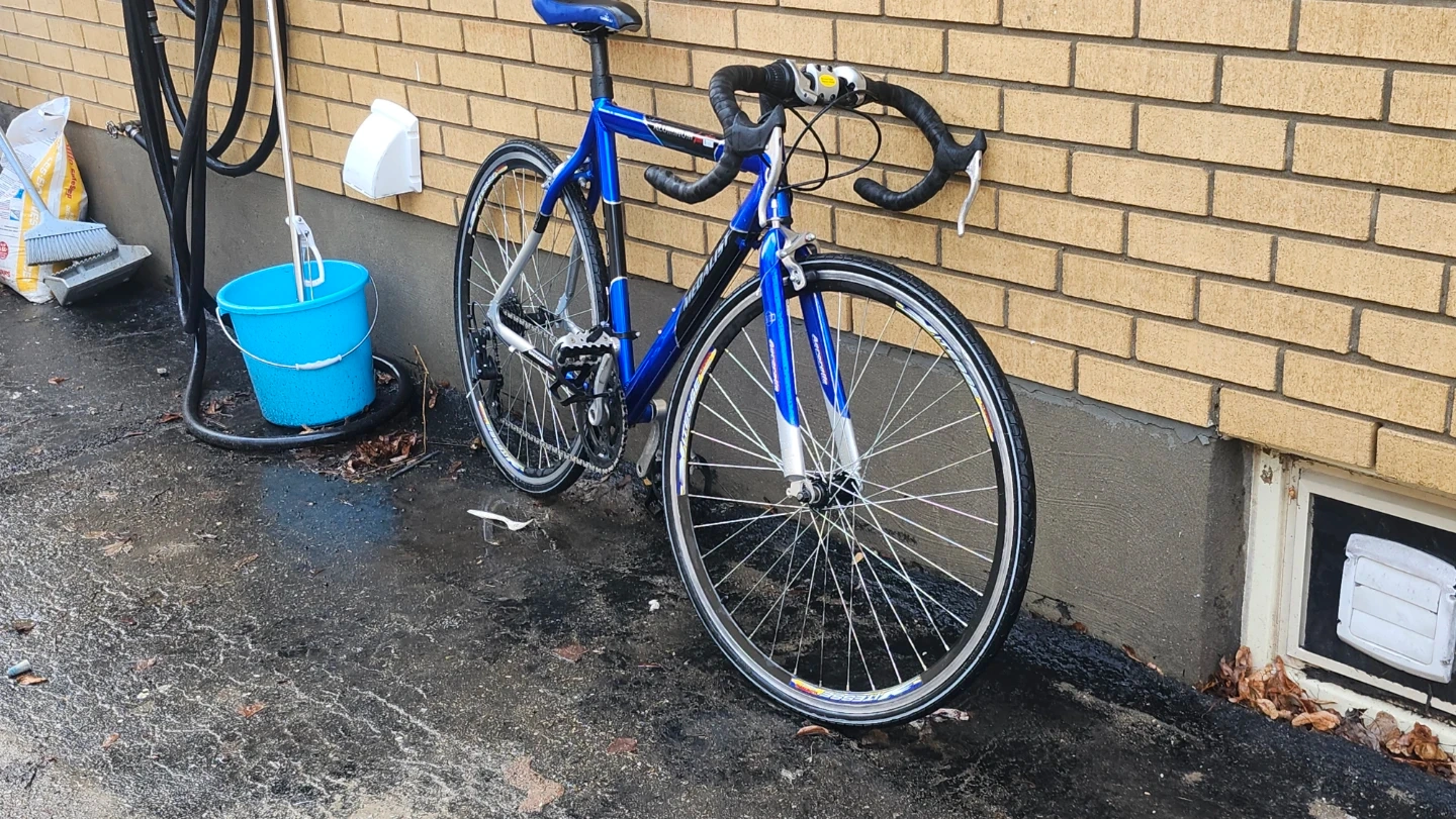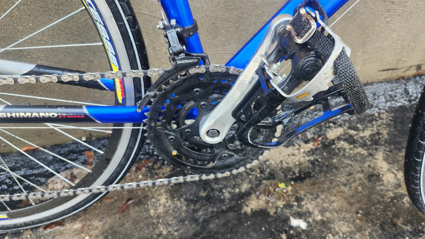 This is a blue road bike featuring Shimano components and 21 speeds. It's equipped with caliper brakes, new jockey wheels, and just lubed the chain. Includes straps aswell.