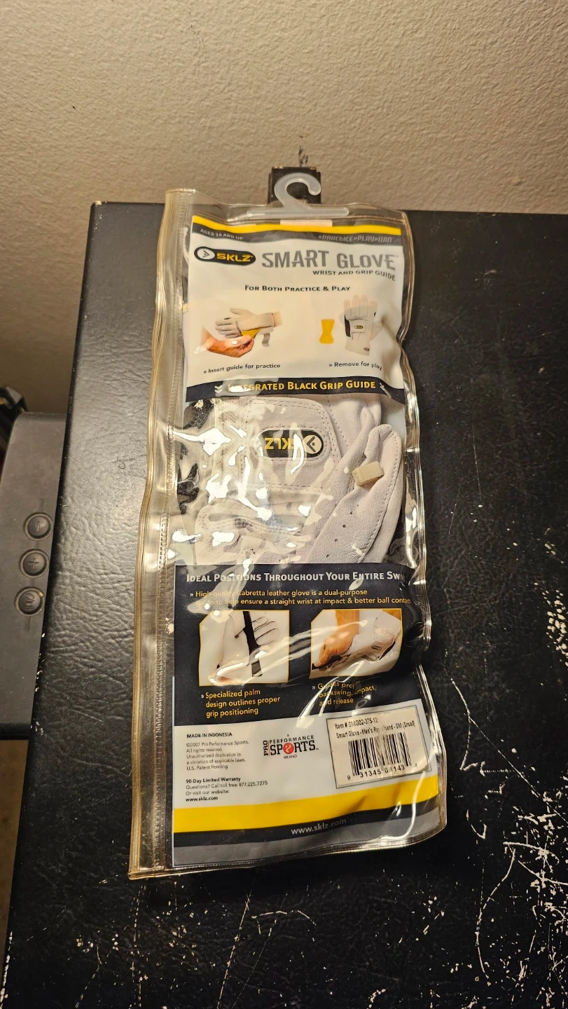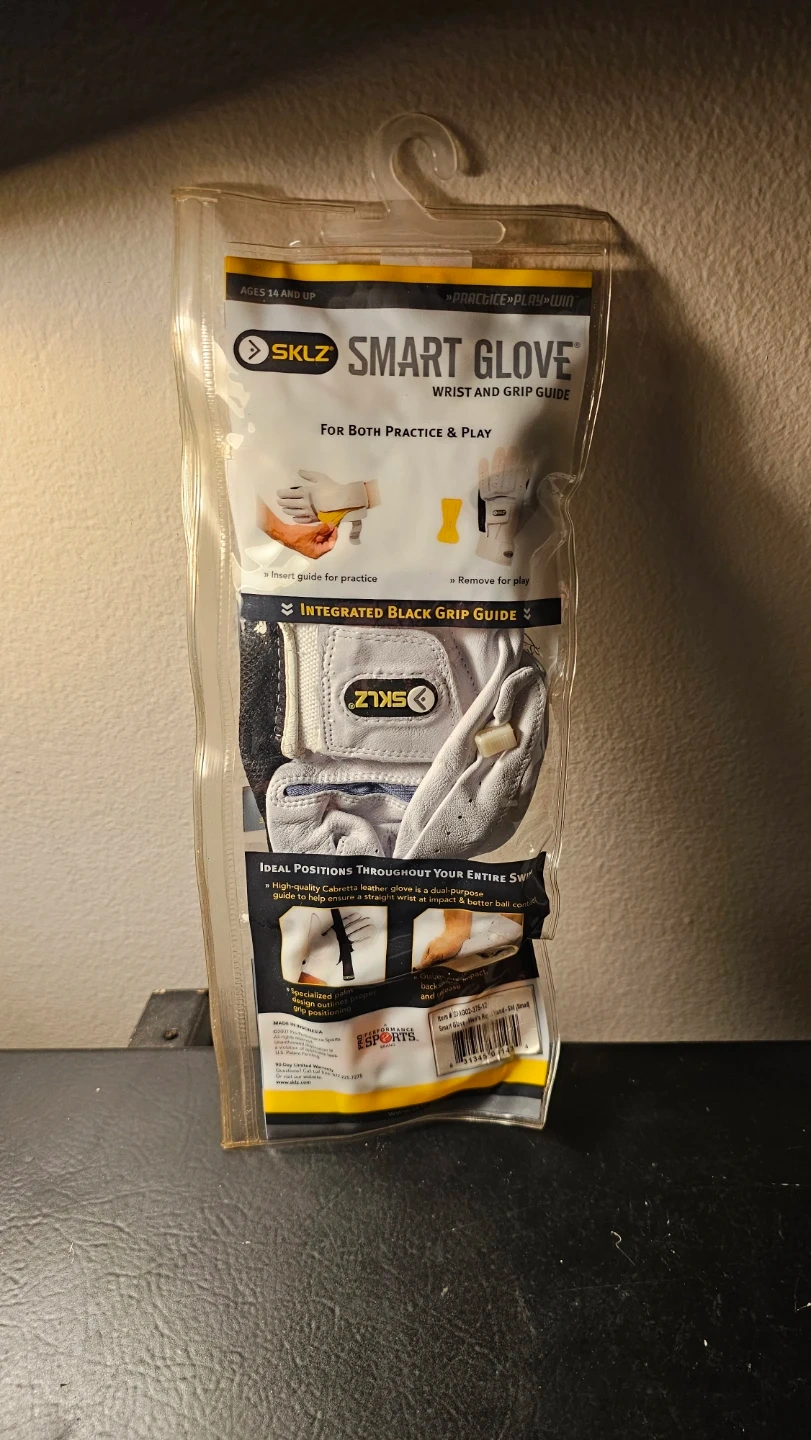 Selling a new SKLZ Smart Glove is designed to help you feel the proper positioning throughout your entire swing. It includes an integrated black grip guide for practice and can be used for both practice and play. Specialized palm design outlines proper grip points.