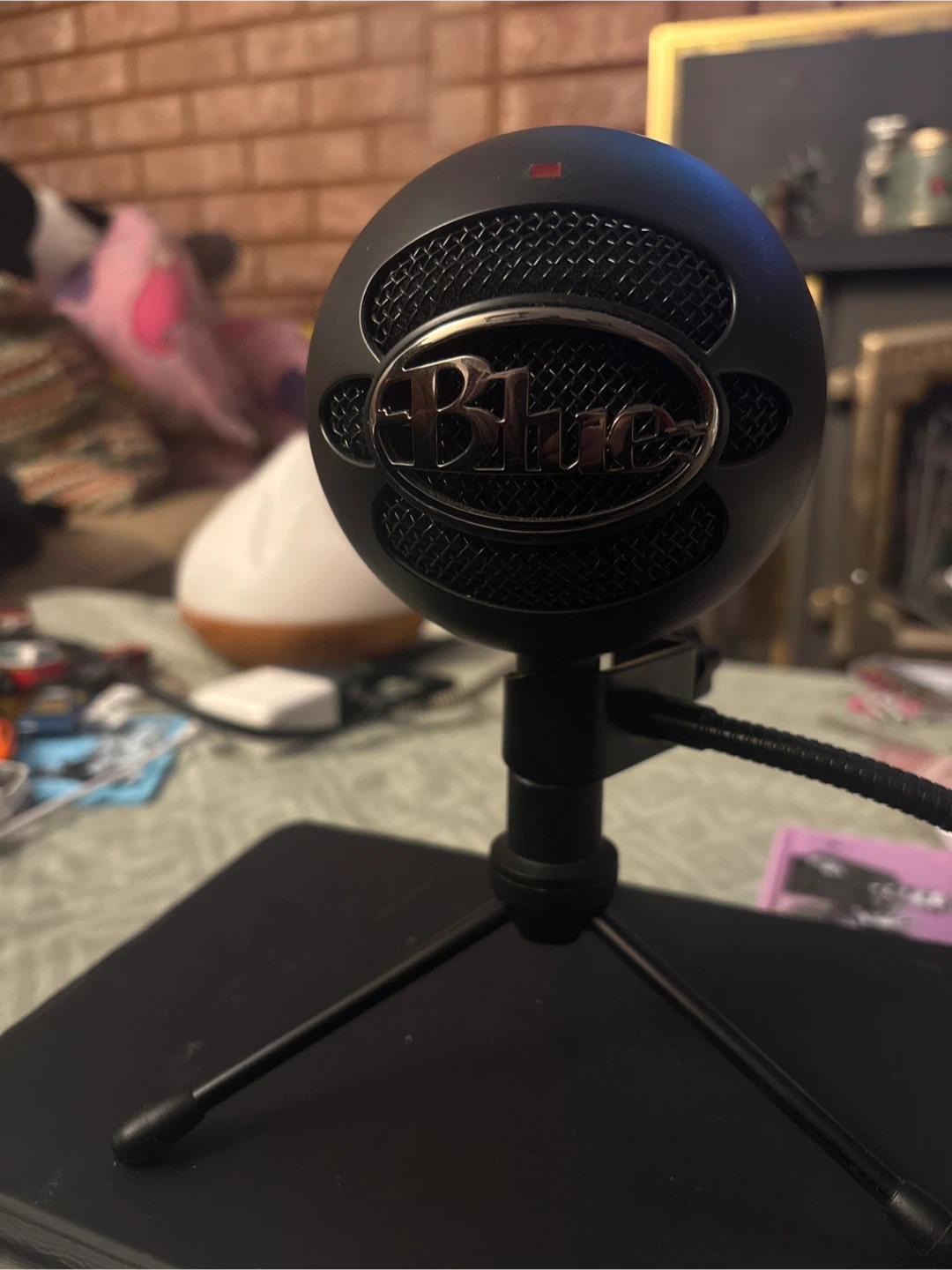 This is a Blue Snowball iCE USB microphone, perfect for voiceovers or podcasts. It's got a compact design and comes with a pop filter to improve audio quality. It's an easy-to-use microphone for capturing clear sound.