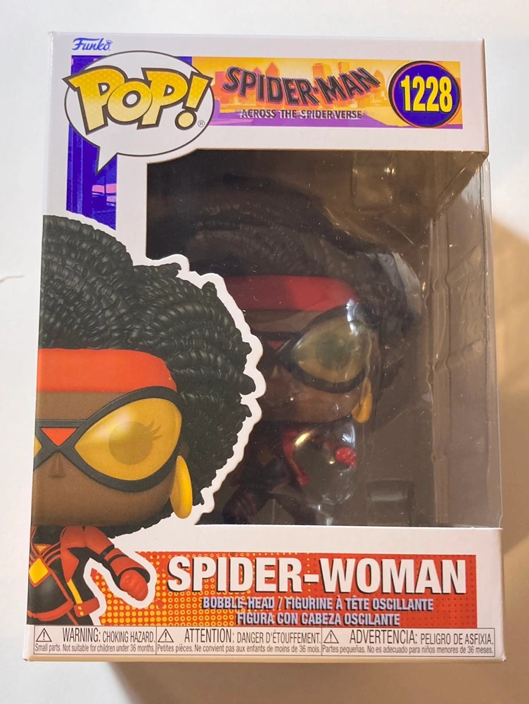 Spider-Woman Pop! Vinyl Figure from Spider-Man: Across the Spider-Verse. It is brand new and unopened in the original packaging.