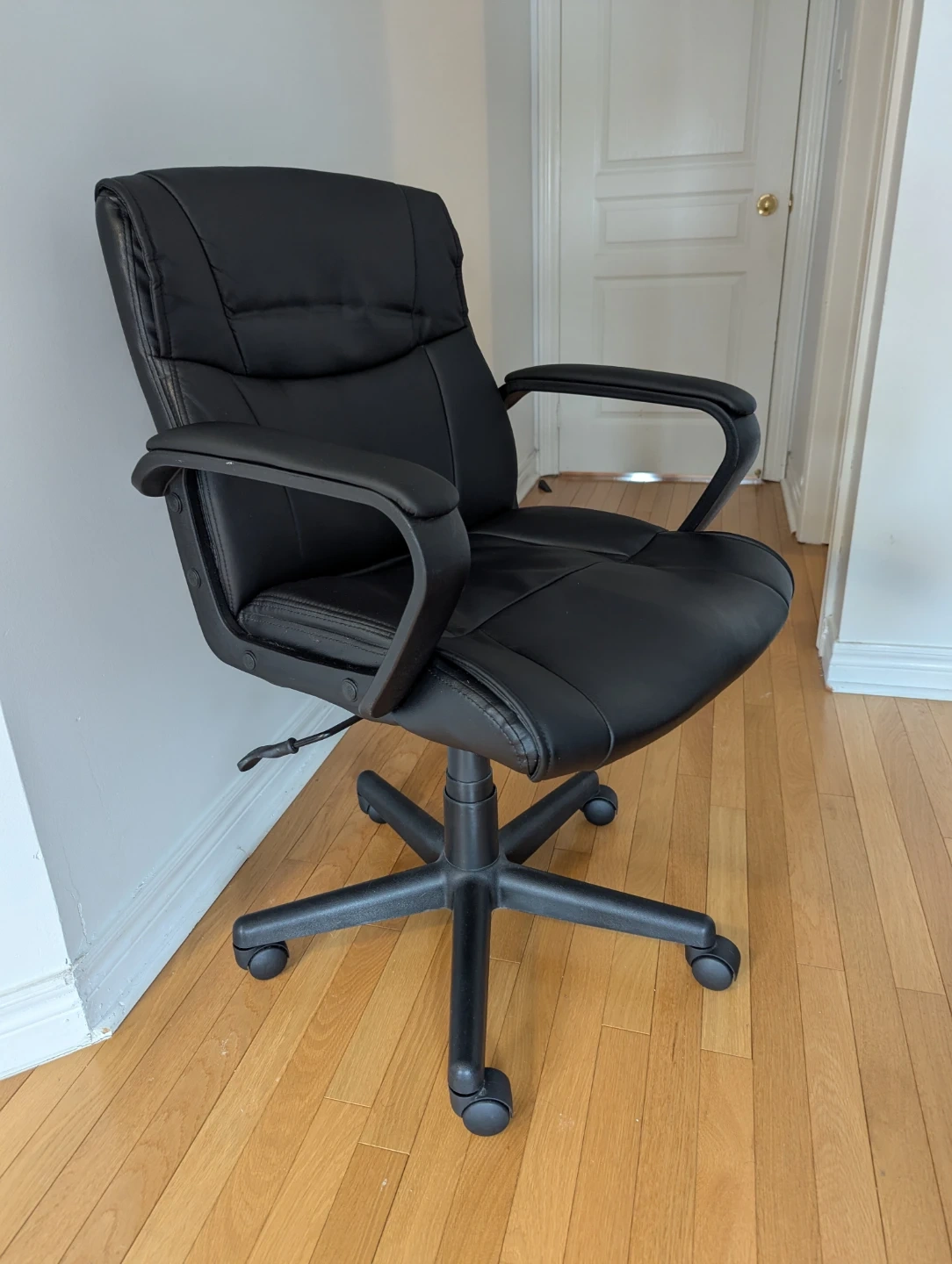 Selling my chair with light usage (I work from the office fully and don't need it taking up space). It has a padded seat and backrest for comfort. The chair features a five-star base with wheels for easy mobility. It's suitable for a home office or workspace! The wheels work well on a floor mat or hardwood floor, but wouldn't be ideal for a thicker carpet.