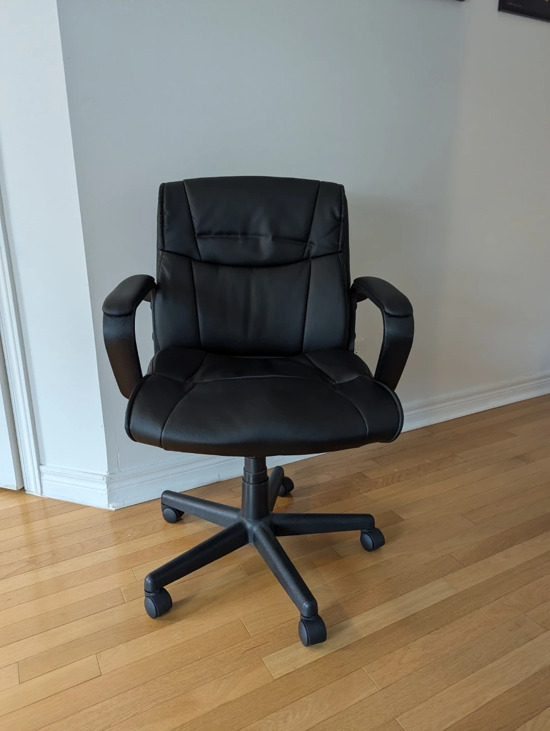 Selling my chair with light usage (I work from the office fully and don't need it taking up space). It has a padded seat and backrest for comfort. The chair features a five-star base with wheels for easy mobility. It's suitable for a home office or workspace! The wheels work well on a floor mat or hardwood floor, but wouldn't be ideal for a thicker carpet.