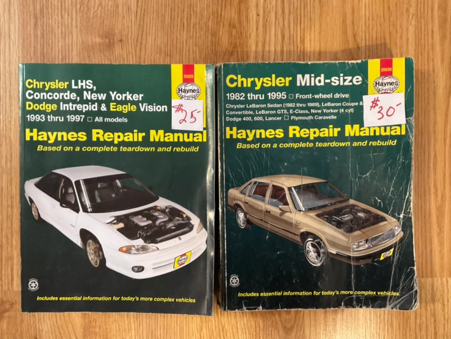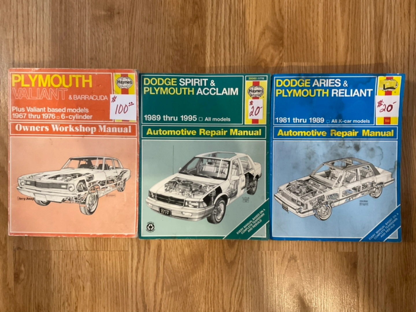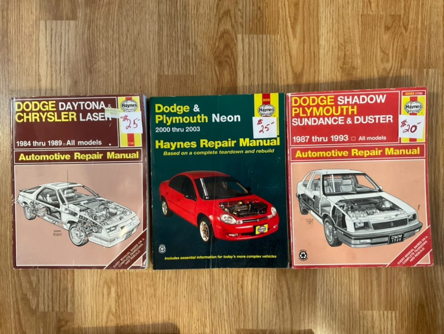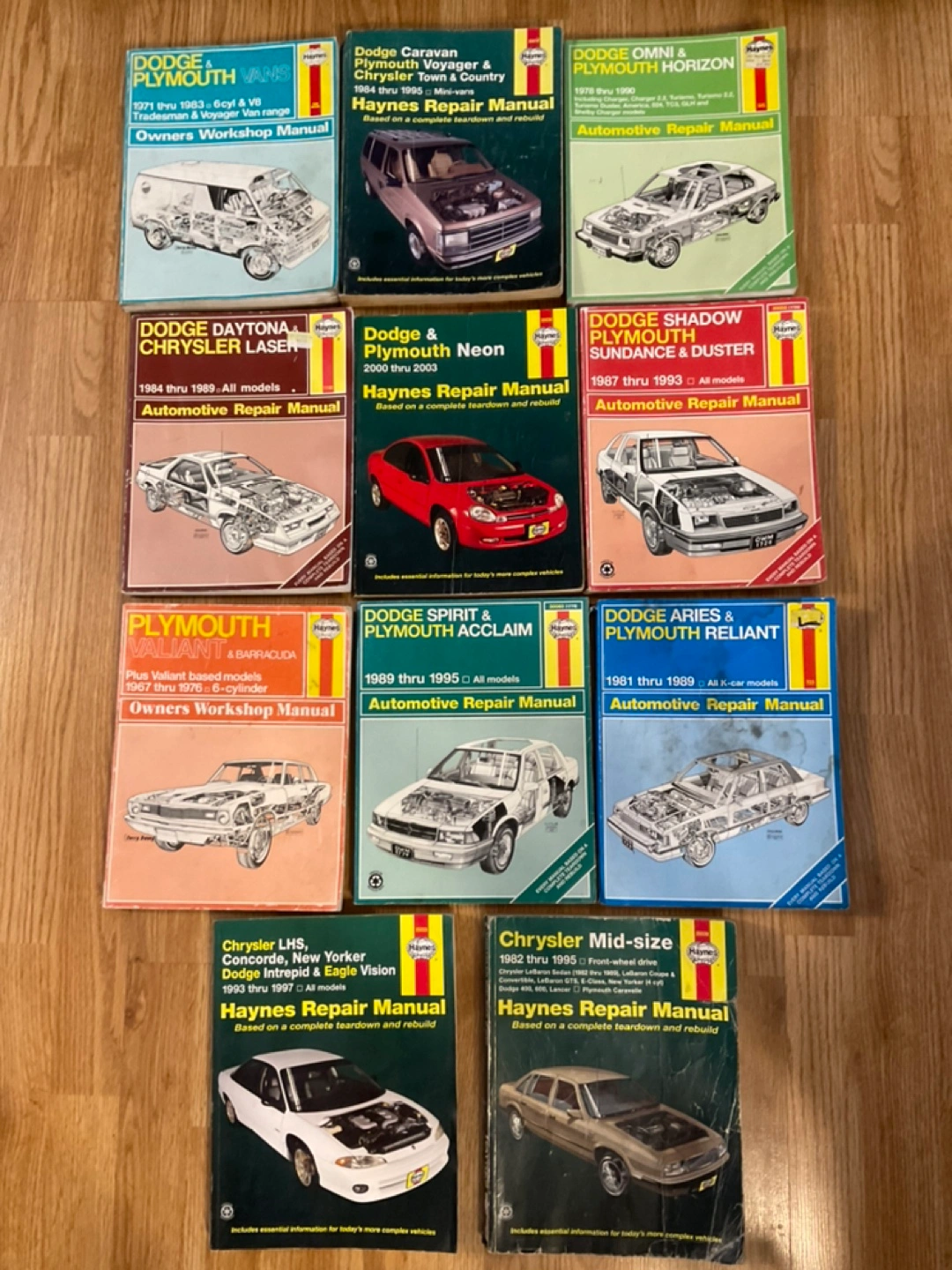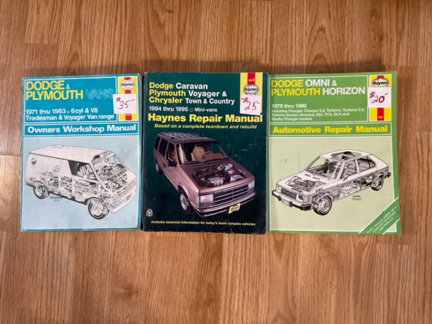 DODGE, PLYMOUTH, CHRYSLER, CUDA, VALIANT, ETC. HAYNES MANUALS. RANGING FROM 1967 - 2003. See pics for manuals available and prices. Pick up is in SELKIRK, MANITOBA. CROSS POSTED.