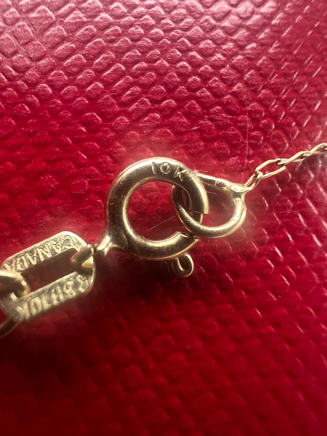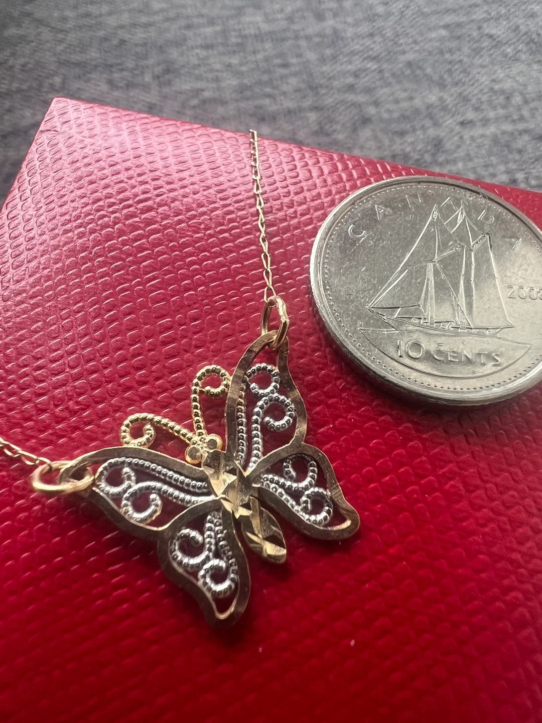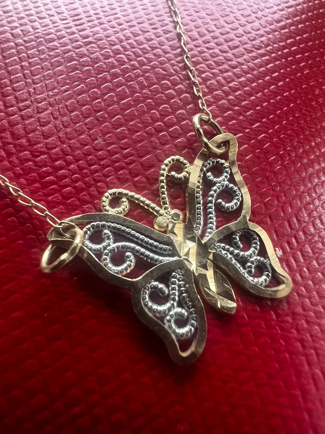 This is a beautiful 10K gold butterfly necklace. It features an intricate filigree design, showcasing both yellow and white gold tones. The clasp is secure and stamped "10K".