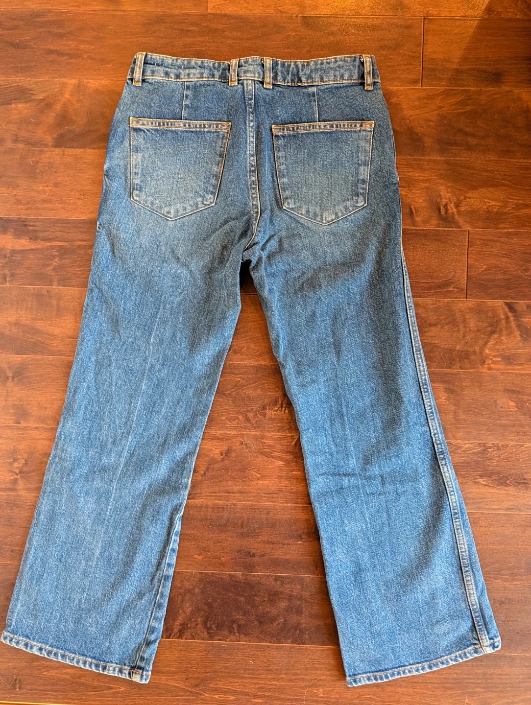 Dark wash midrise denim jeans with a cropped flare leg. Five-pocket styling and zip fly.