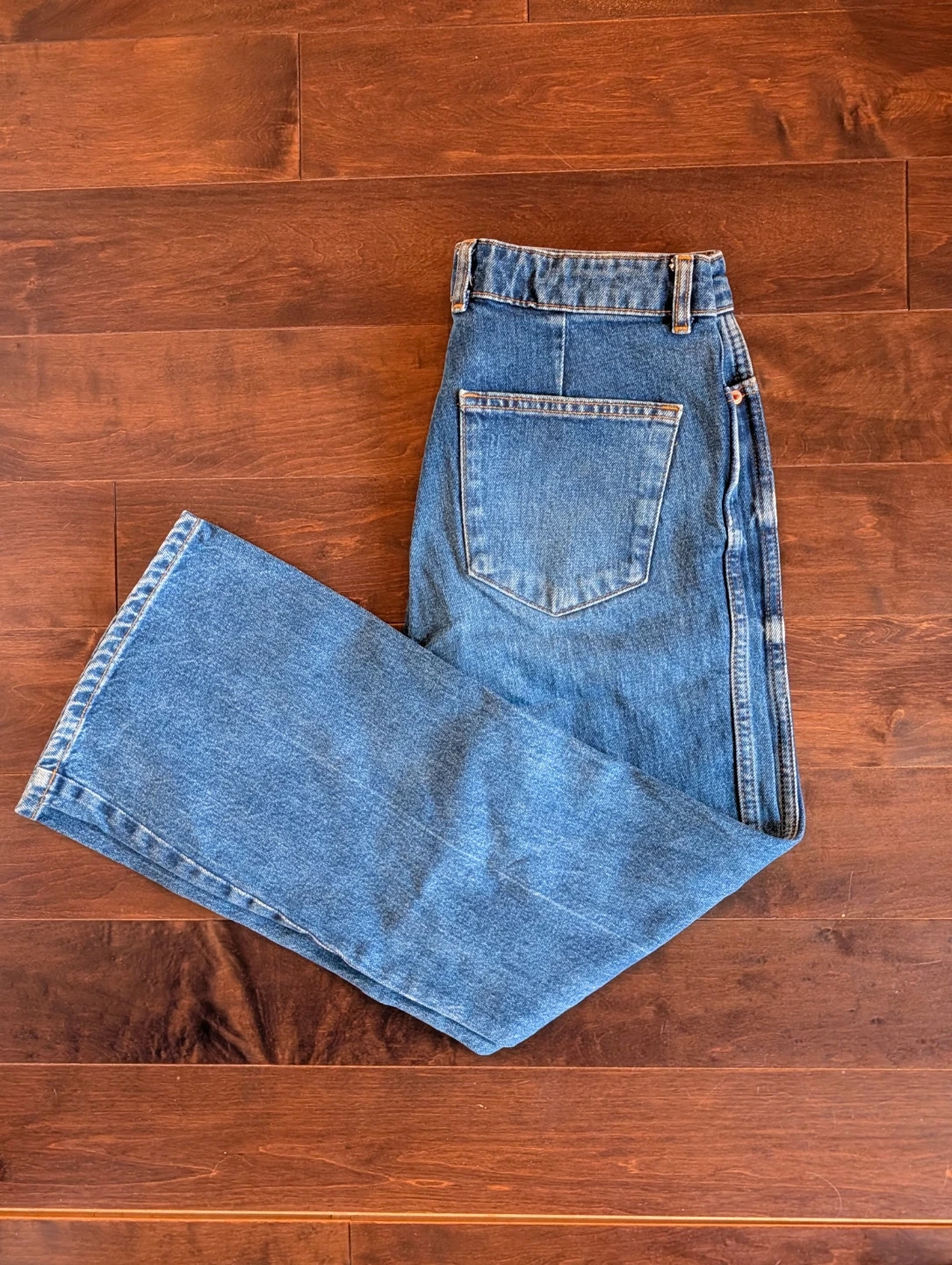 Dark wash midrise denim jeans with a cropped flare leg. Five-pocket styling and zip fly.