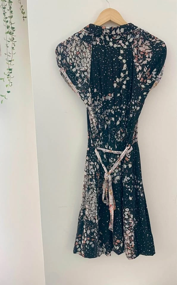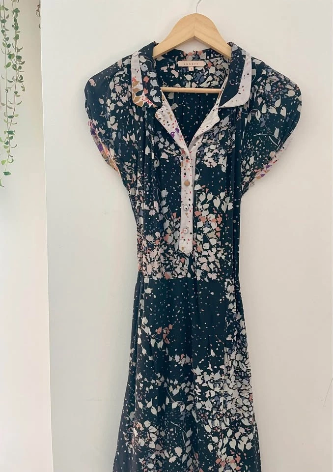 Beautiful Sandro Sheer Floral pattern Frilly short sleeves Dress Size 1. Only worn a few times, excellent condition. Features a claudine collar, belt and fabric covered buttons. Has a vintage sophisticated and timeless look. Armpit to armpit 23”, Shoulder to hem 24”. Pick up only, near Fort York in Toronto.