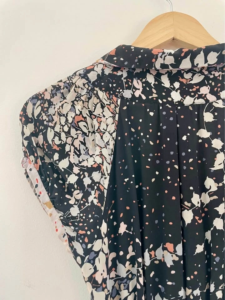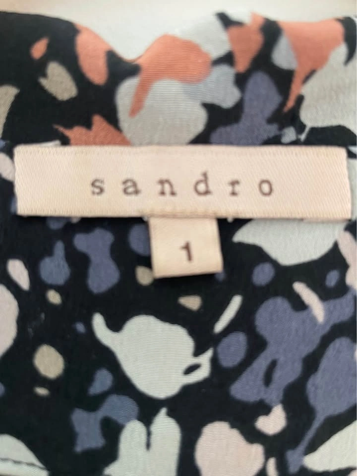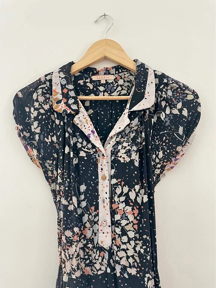 Beautiful Sandro Sheer Floral pattern Frilly short sleeves Dress Size 1. Only worn a few times, excellent condition. Features a claudine collar, belt and fabric covered buttons. Has a vintage sophisticated and timeless look. Armpit to armpit 23”, Shoulder to hem 24”. Pick up only, near Fort York in Toronto.