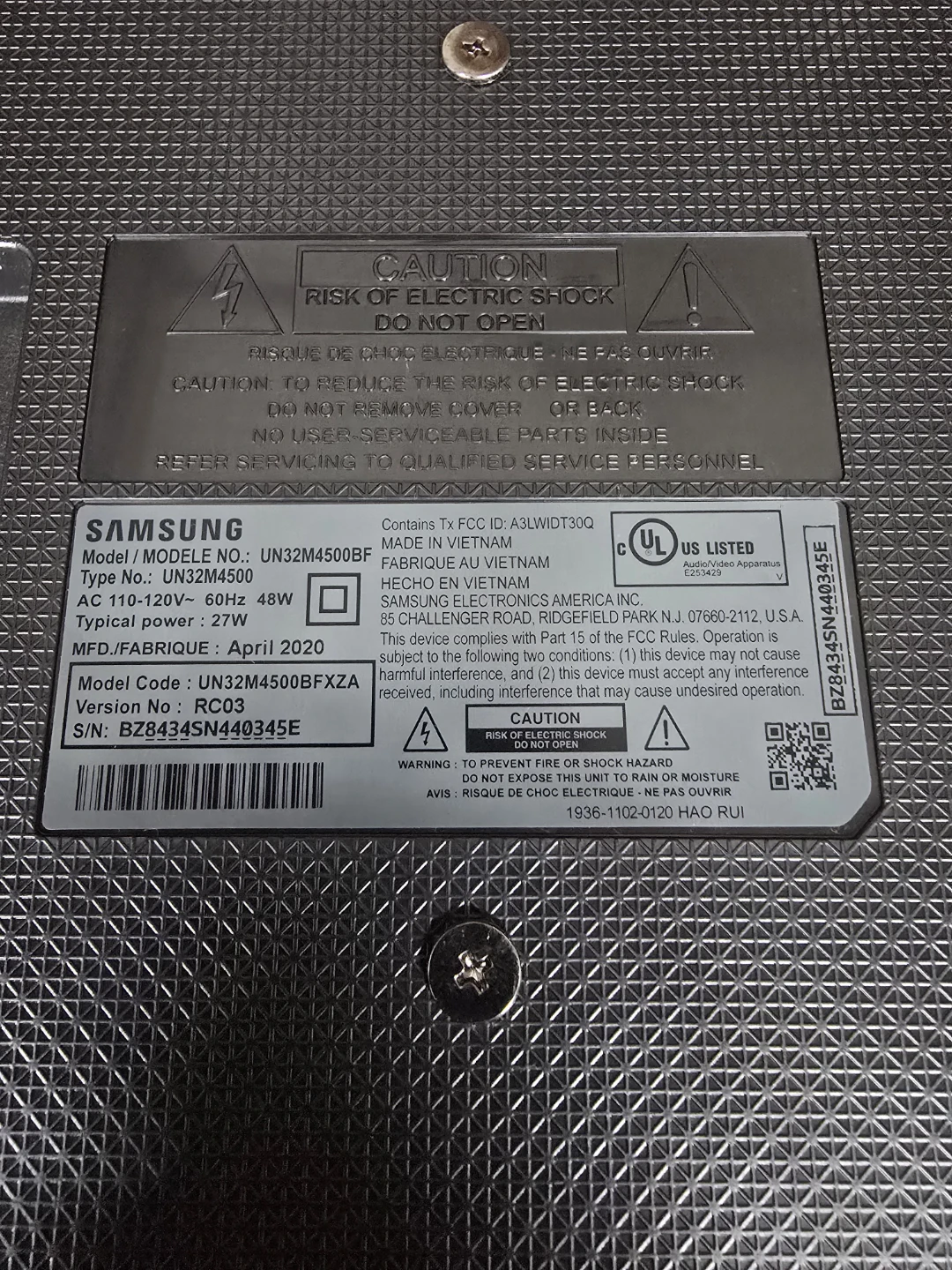 Samsung UN32M4500 model LED TV. Manufactured April 2020. It's a 32-inch screen with 720p resolution and 60Hz refresh rate. Typical power consumption is 27W...