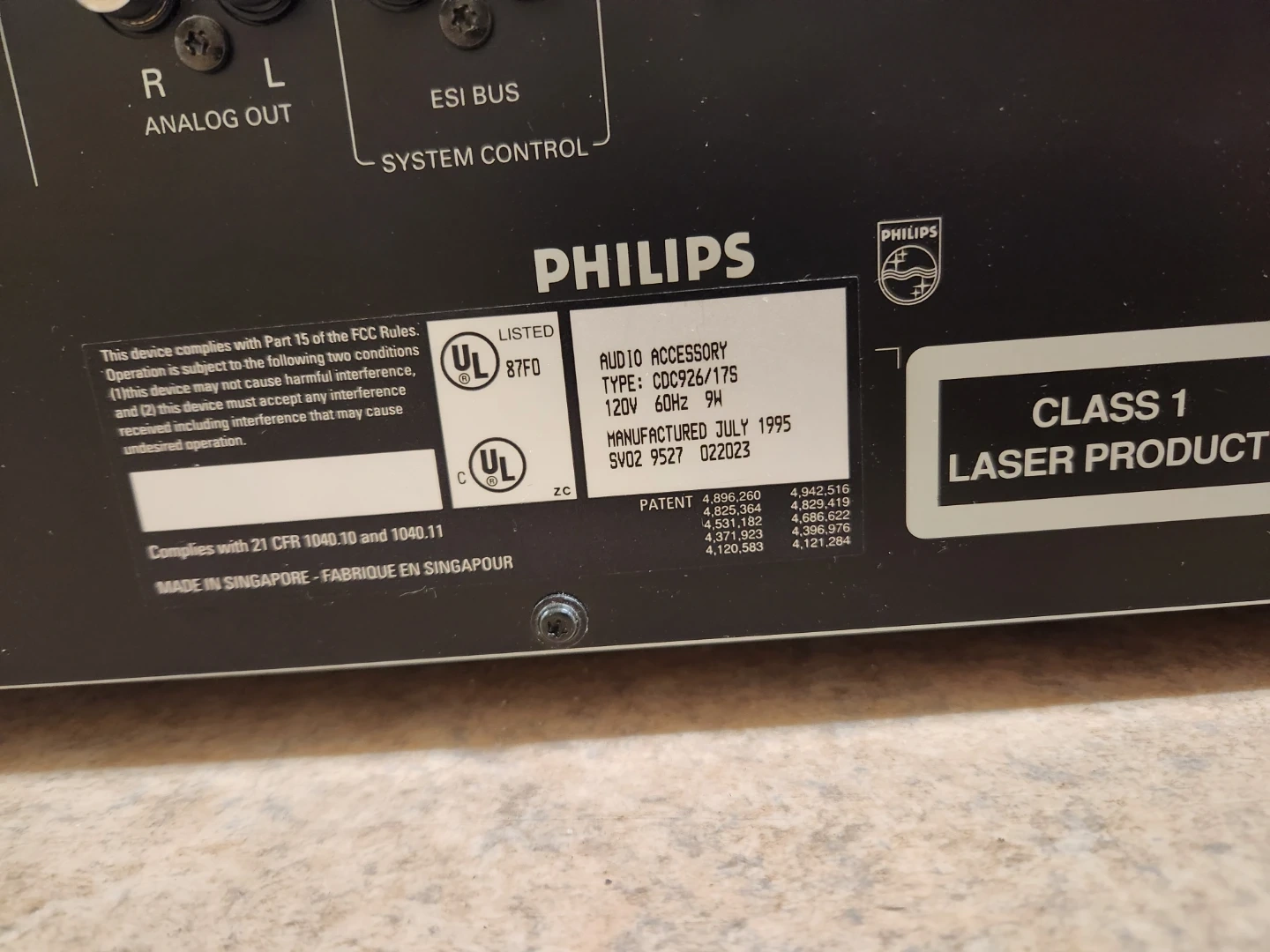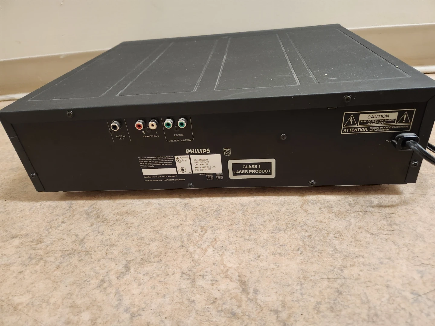 This is a Philips 5-disc compact CD changer. It was manufactured in July 1995. It features analog audio outputs and a digital output. Comes with remote (not in photo)