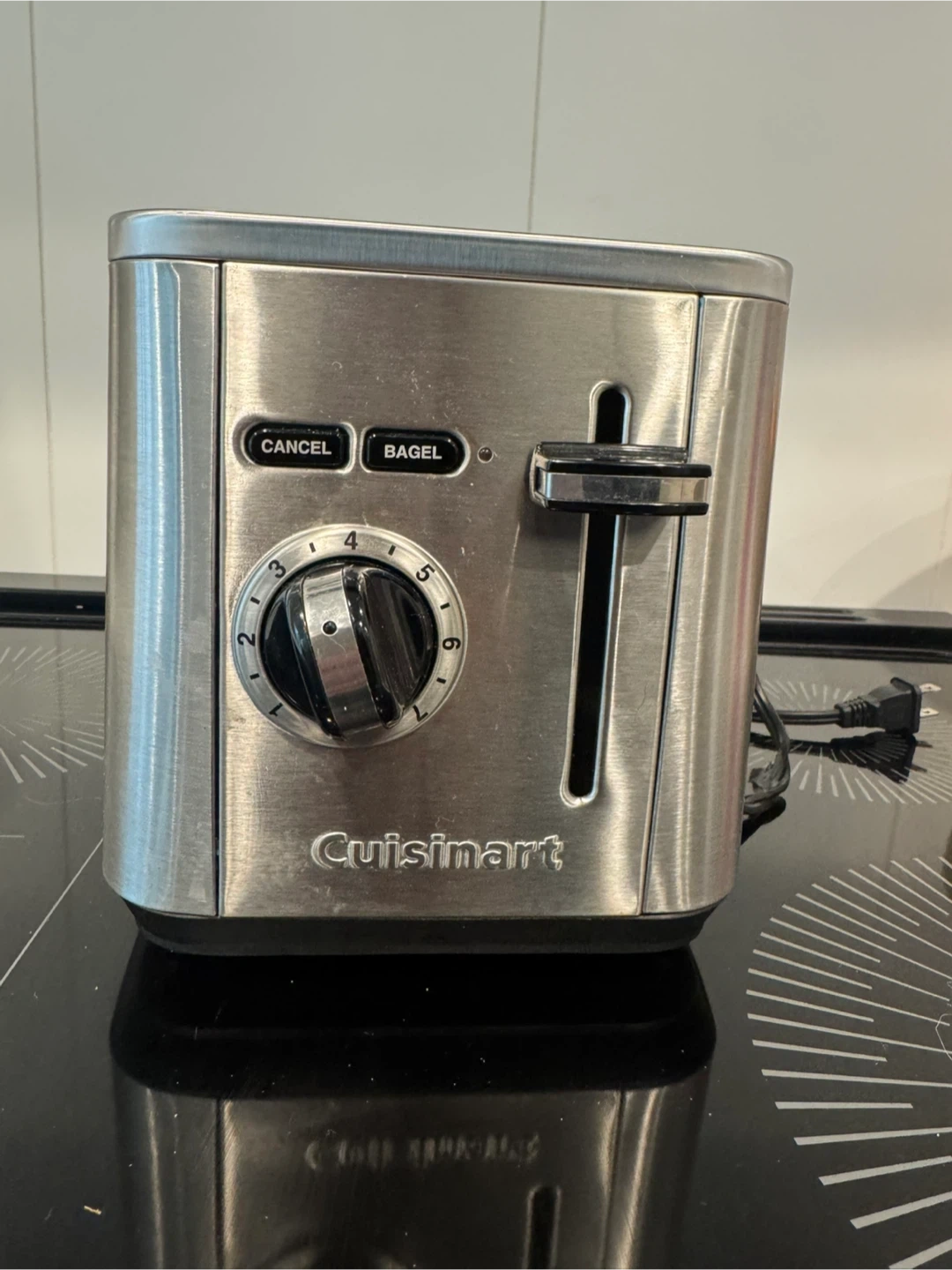 This Cuisinart toaster features a brushed stainless steel finish and dual slots for your bread. It has a browning control dial with settings from 1 to 6 and a convenient bagel function. A cancel button is also included for immediate stopping. It's a solid appliance for making toast or bagels.