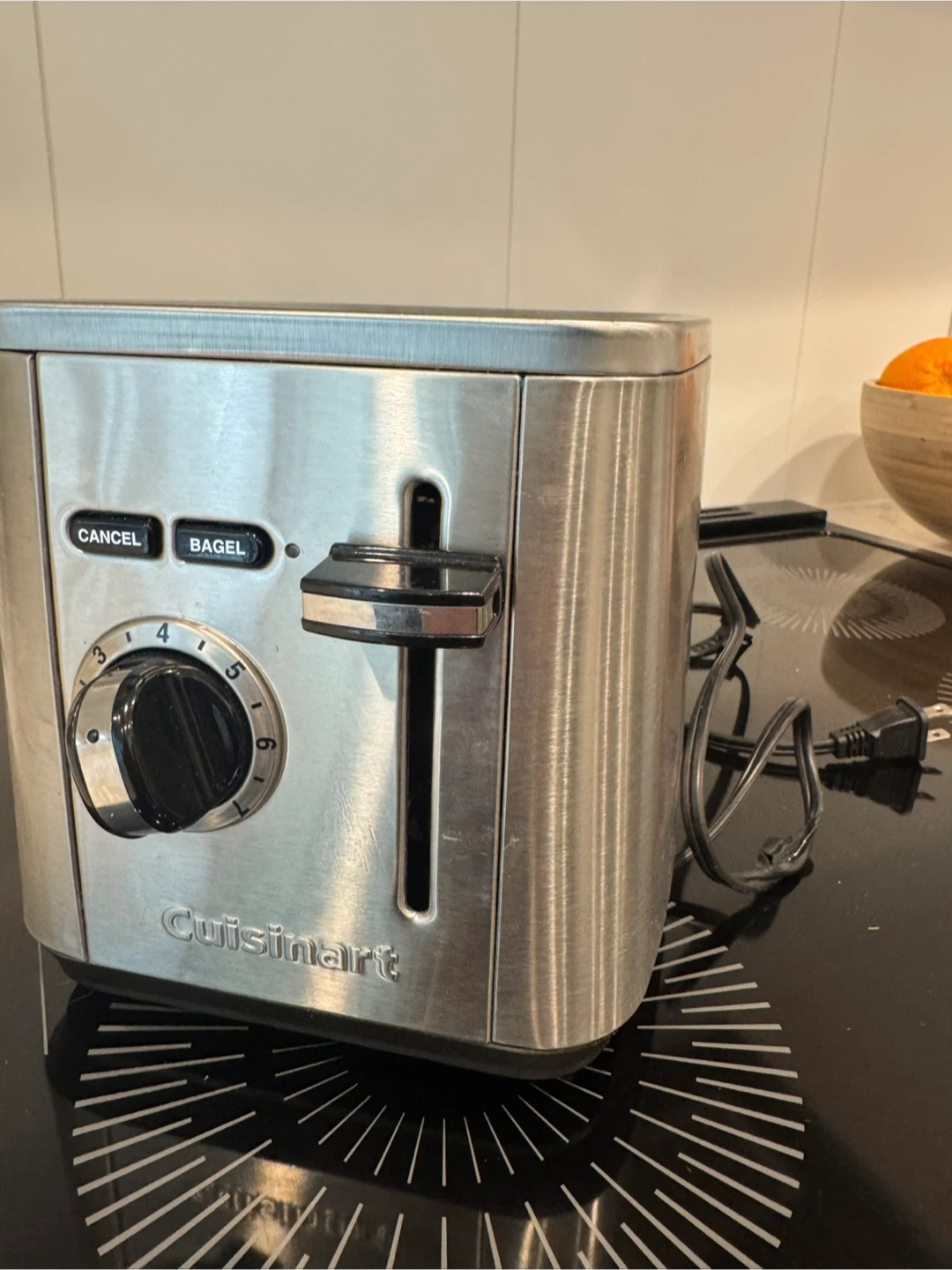 This Cuisinart toaster features a brushed stainless steel finish and dual slots for your bread. It has a browning control dial with settings from 1 to 6 and a convenient bagel function. A cancel button is also included for immediate stopping. It's a solid appliance for making toast or bagels.