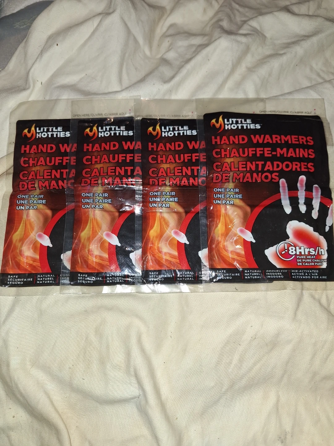 Four pairs of Little Hotties hand warmers are included. They provide up to 8 hours of heat. Safe and natural ingredients.