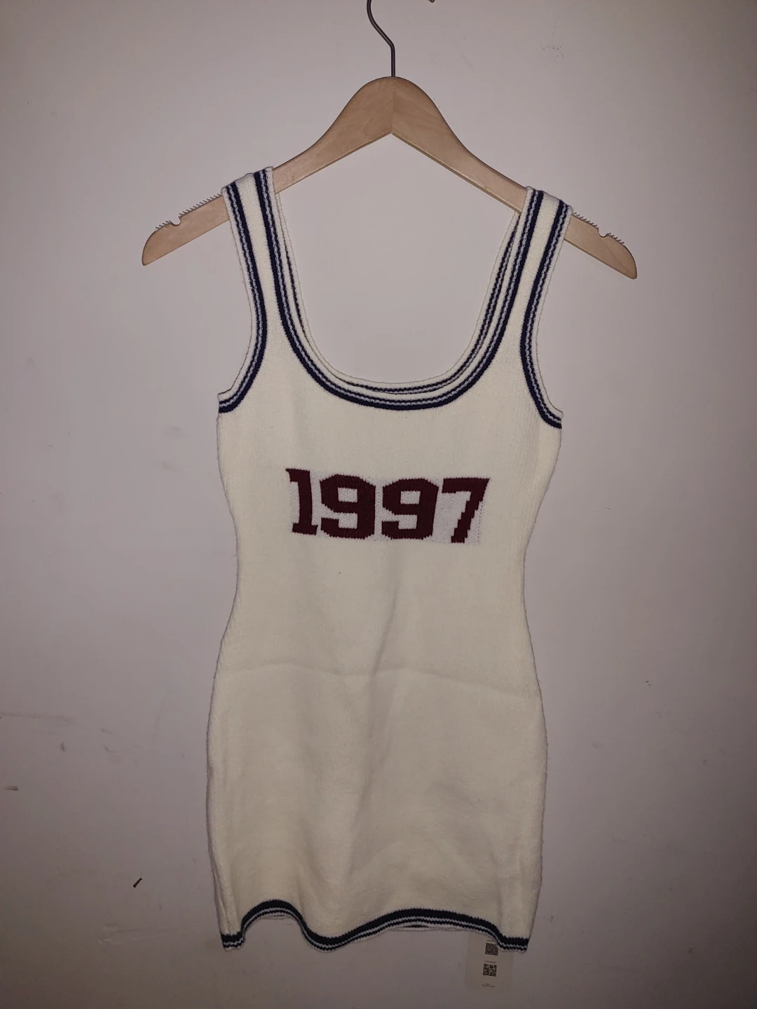 This cream-coloured knit mini dress from MUSERA is a stylish addition to any wardrobe! It features a sporty design with navy blue trim and the number '1997' on the front. The dress is made of 62% acrylic, 32% acrylic, 3% polyester, and 3% polyamide