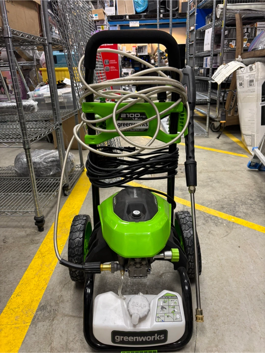 Greenworks pressure washer with 2100 PSI and 1.2 GPM. Includes hose and spray gun. It's a green and black electric model on wheels. Great for outdoor cleaning tasks!