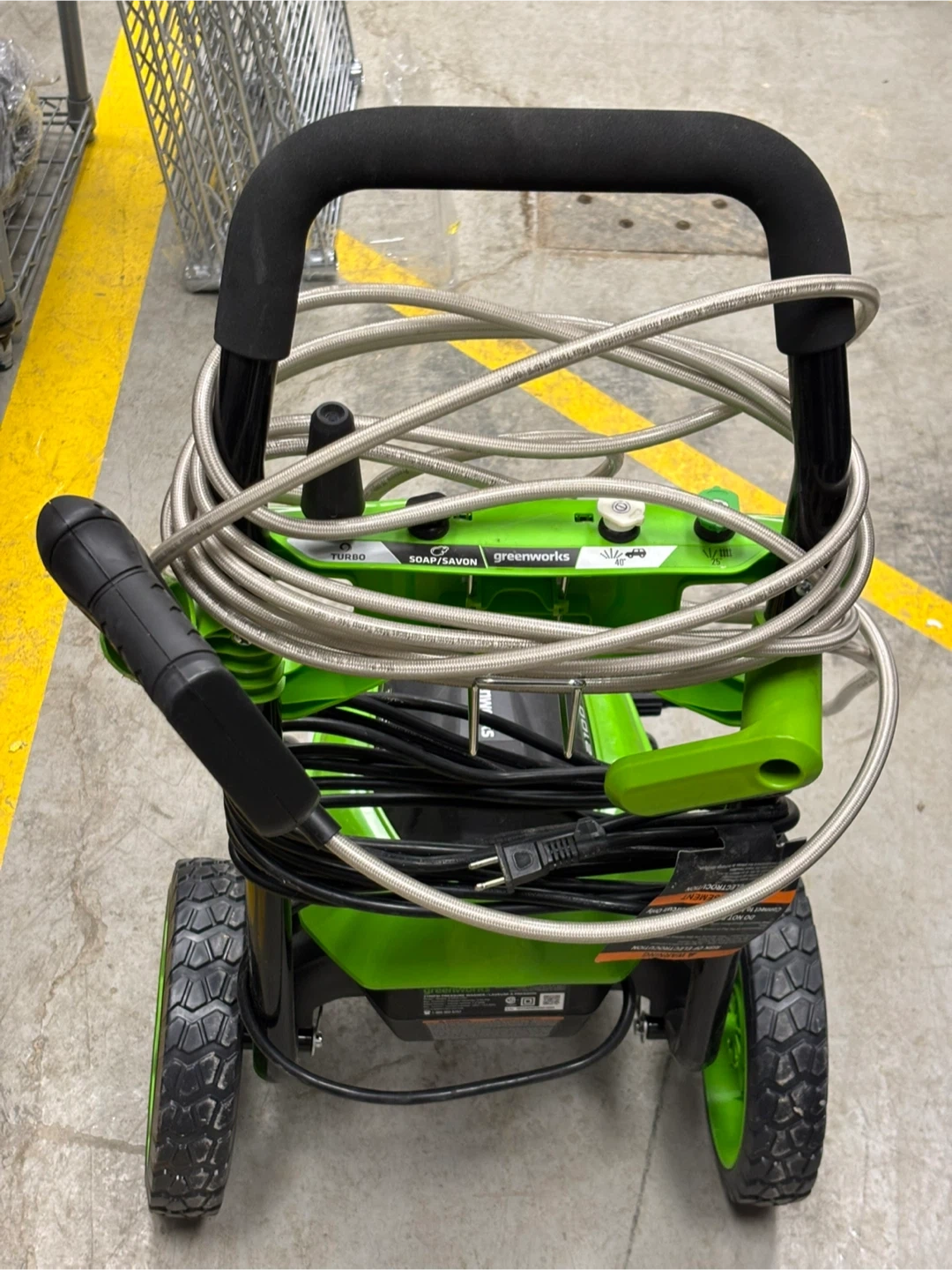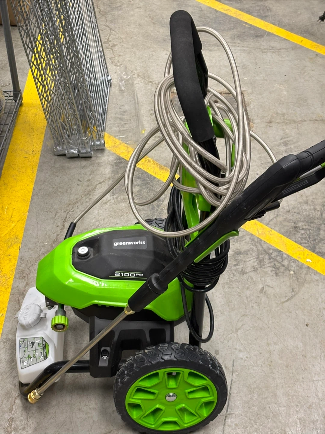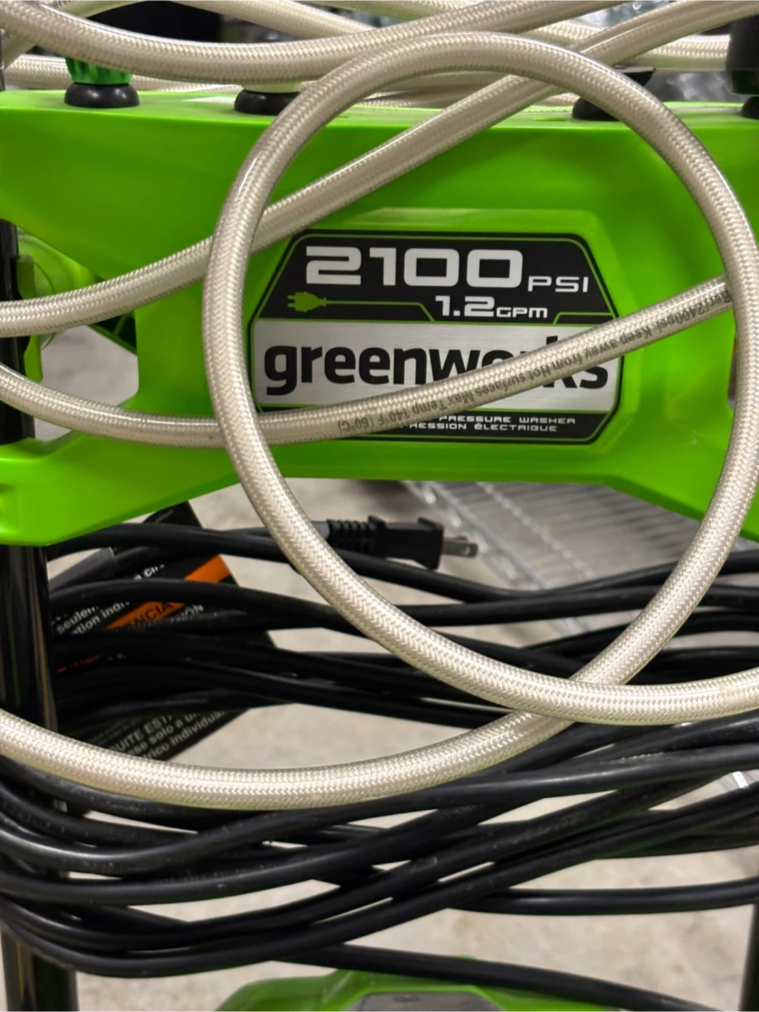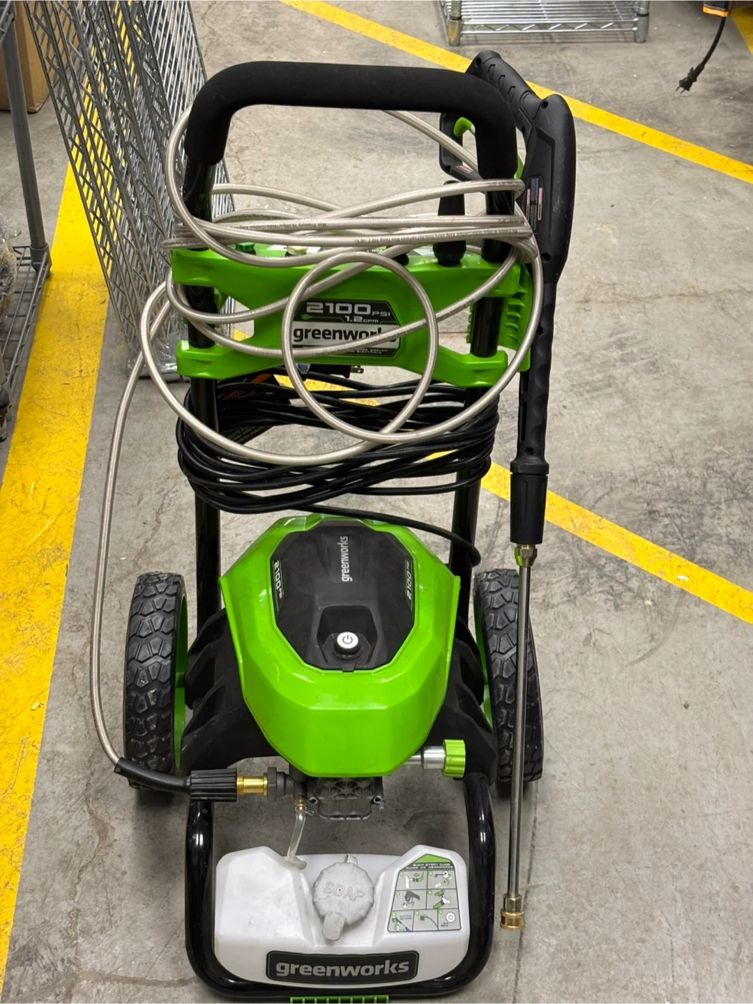 Greenworks pressure washer with 2100 PSI and 1.2 GPM. Includes hose and spray gun. It's a green and black electric model on wheels. Great for outdoor cleaning tasks!