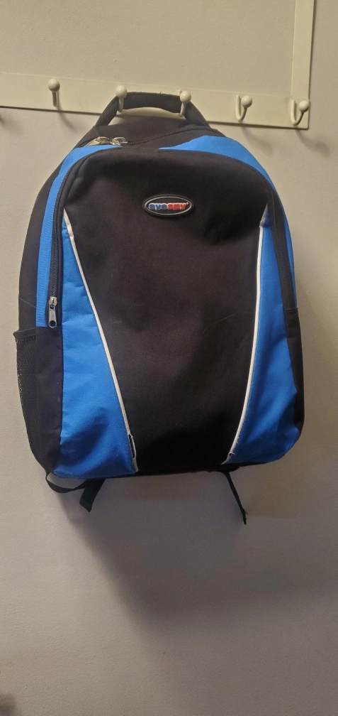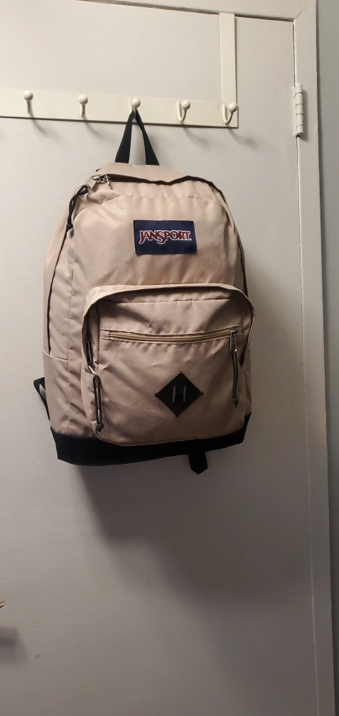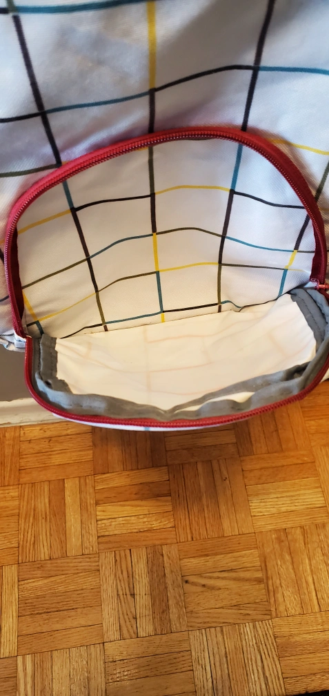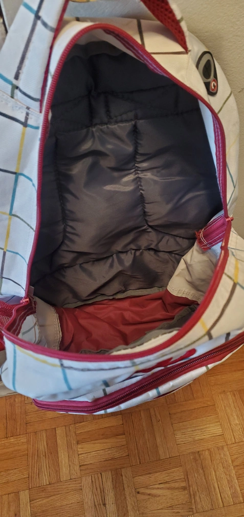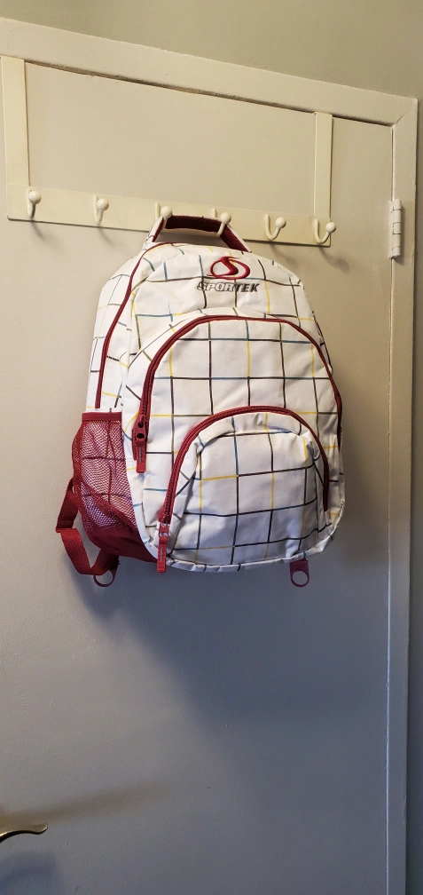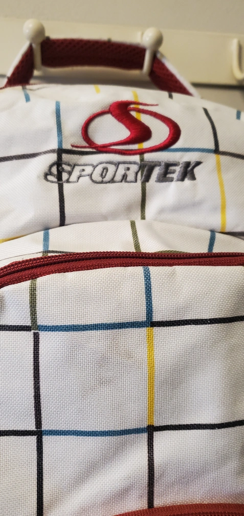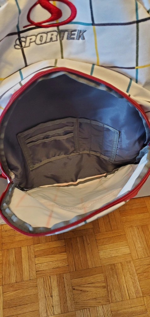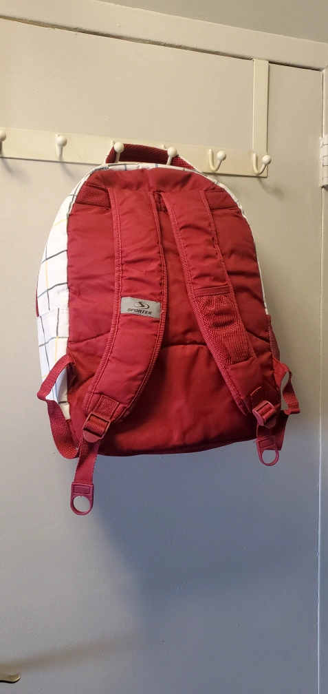 Pre-owned Sportek backpack. Features a white and red plaid design. Multiple zippered compartments. Padded interior. Comfortable shoulder straps. Ideal for school or everyday use.