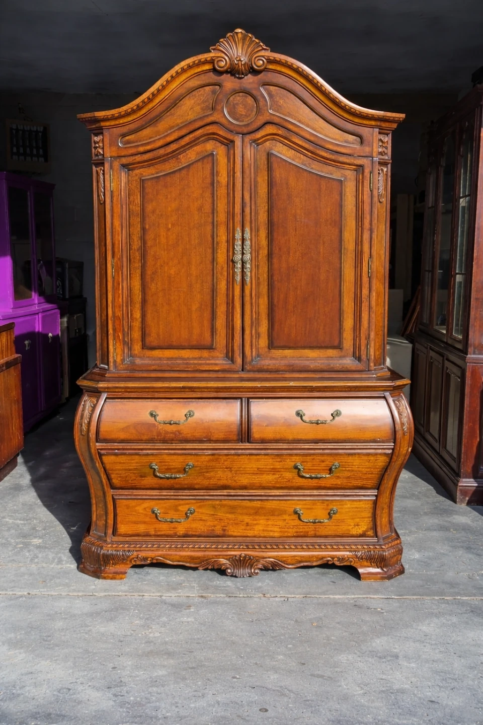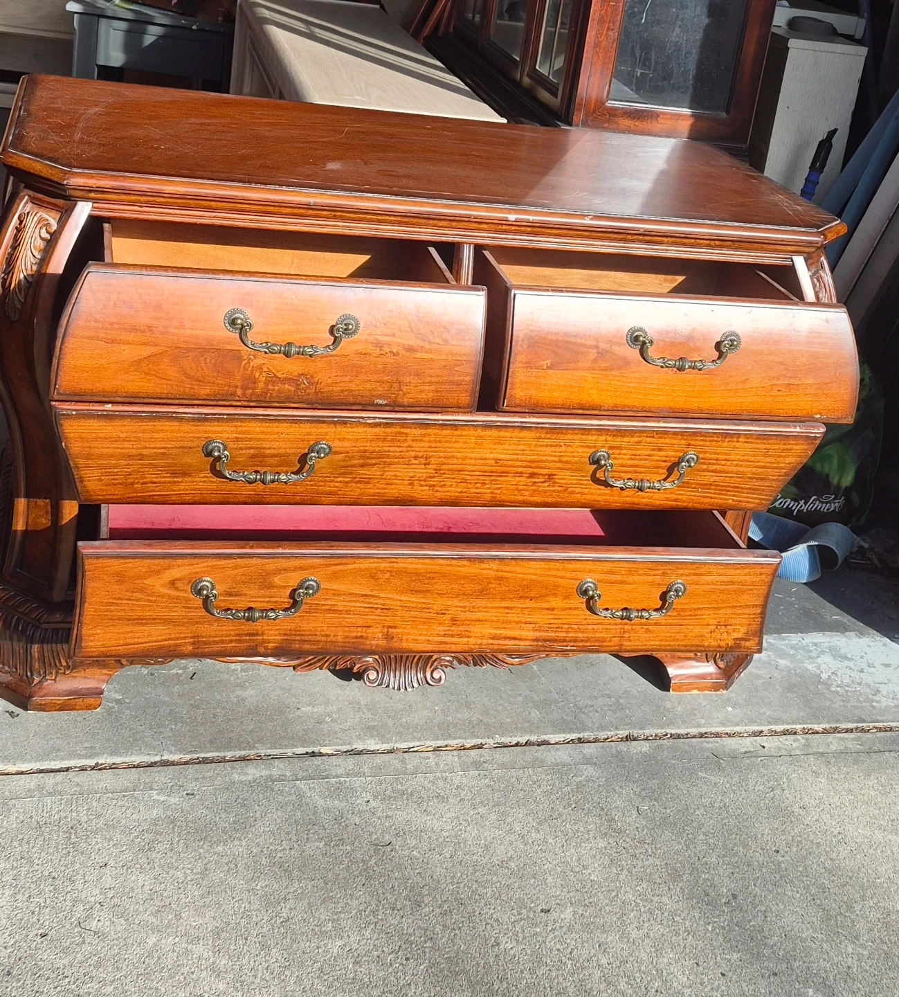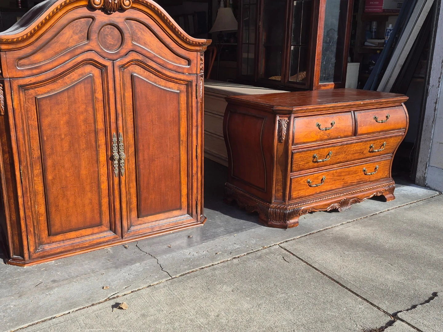 Lovely wooden armoire with two shelves and a bottom drawer. It's accompanied by a matching dresser featuring four drawers. The set has ornate detailing and a rich wood finish.