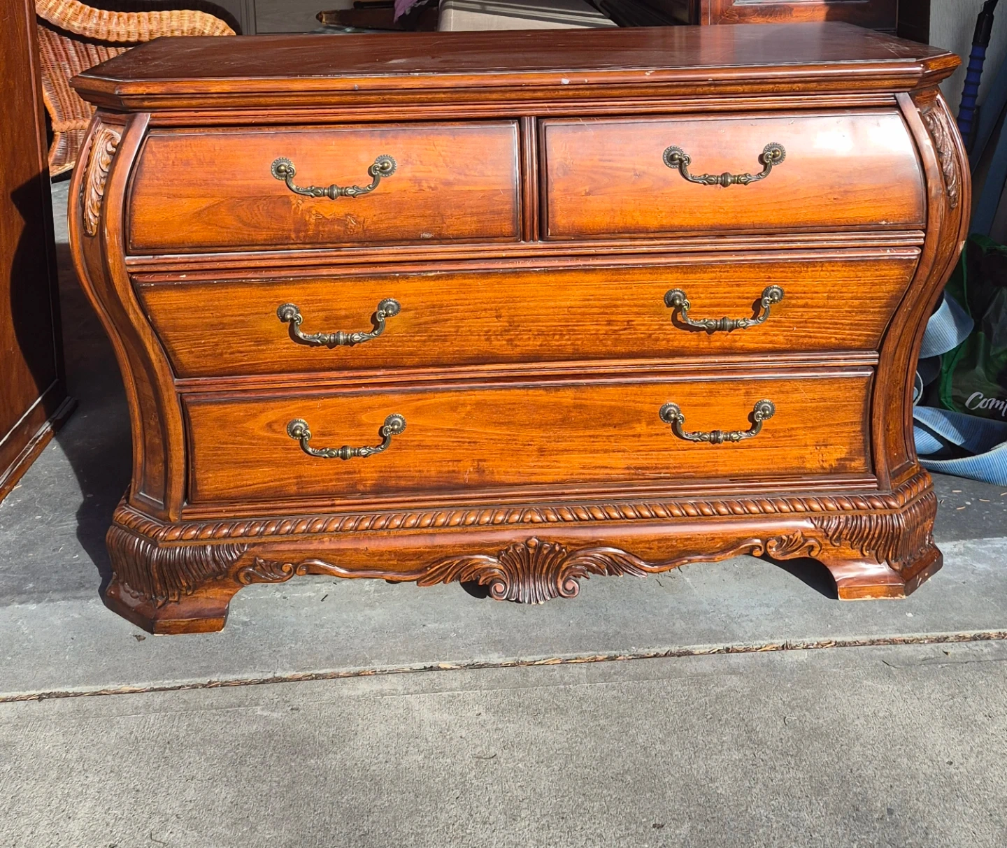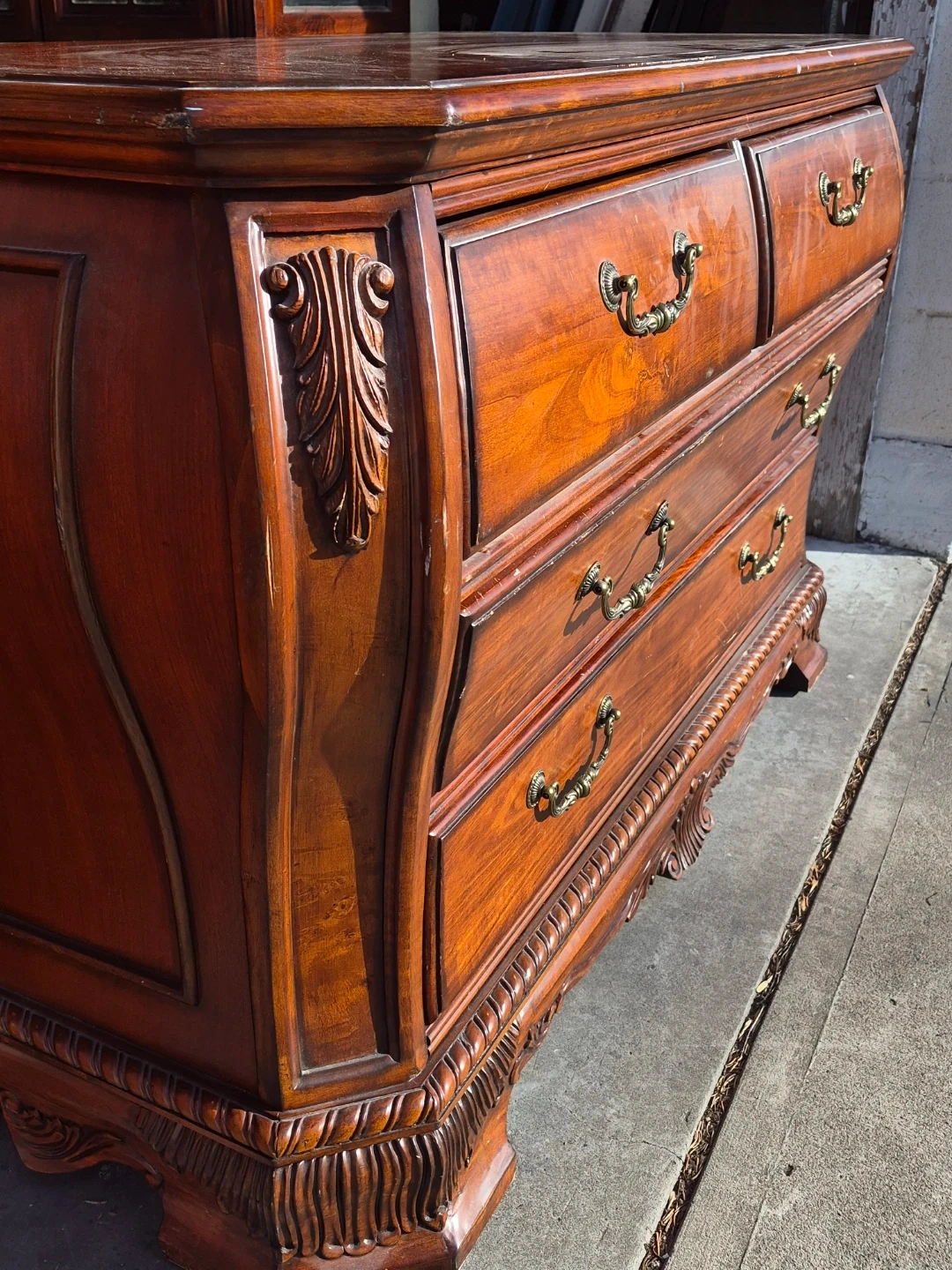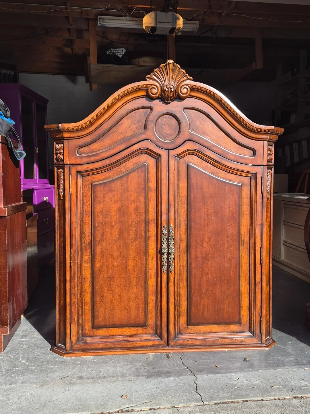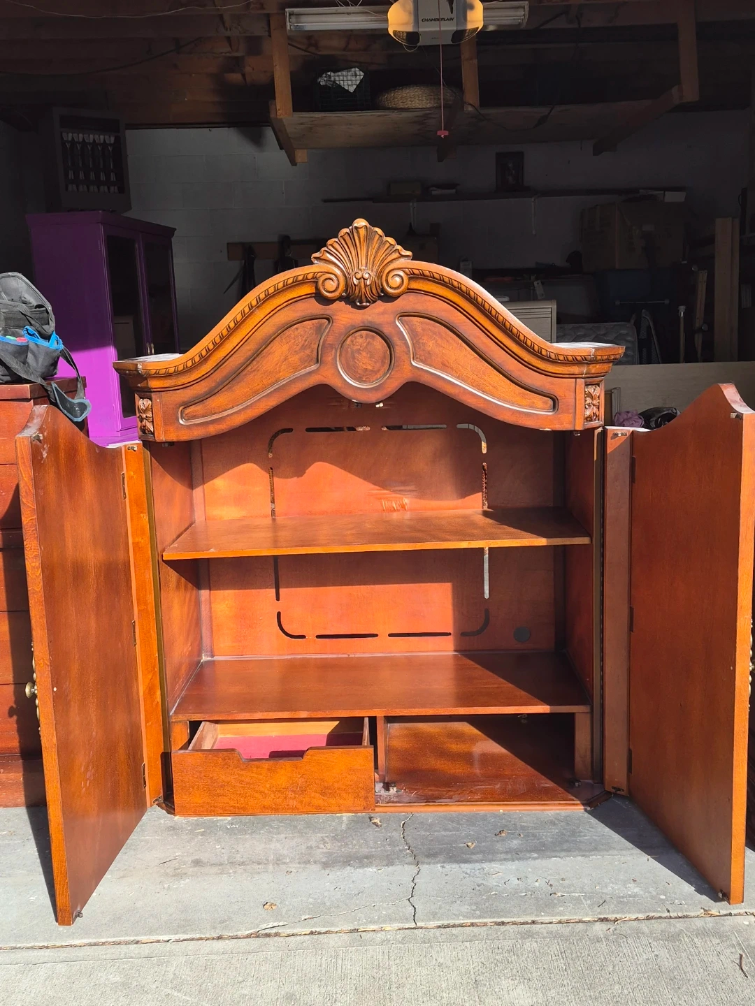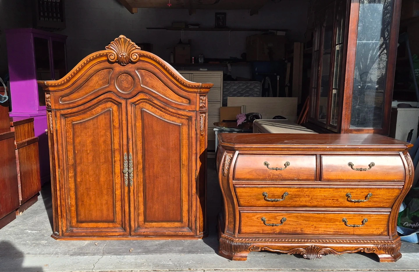 Lovely wooden armoire with two shelves and a bottom drawer. It's accompanied by a matching dresser featuring four drawers. The set has ornate detailing and a rich wood finish.