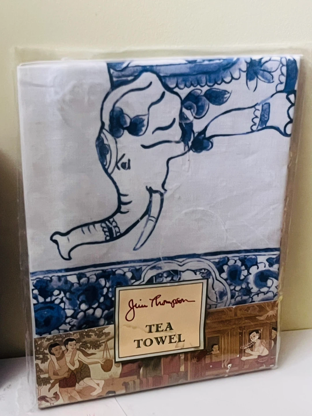 This is a Jim Thompson tea towel featuring a blue and white elephant design. It's made of linen material and comes with original packaging. Use it in the kitchen for drying or as a decorative piece.