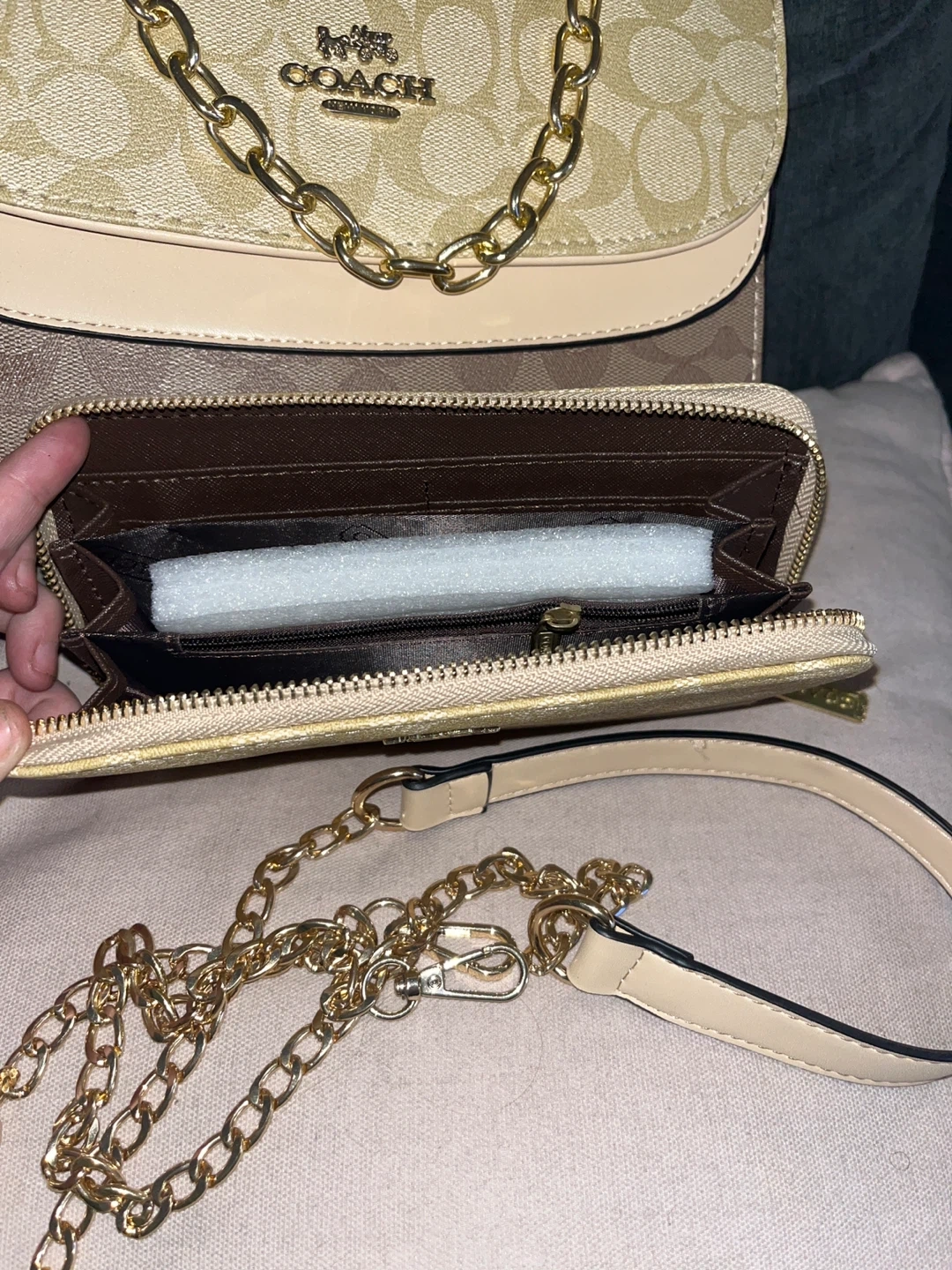 This Coach set includes a signature C print wallet and a matching crossbody bag. Both pieces feature the classic Coach logo and gold-tone hardware. The bag has a chic chain strap.