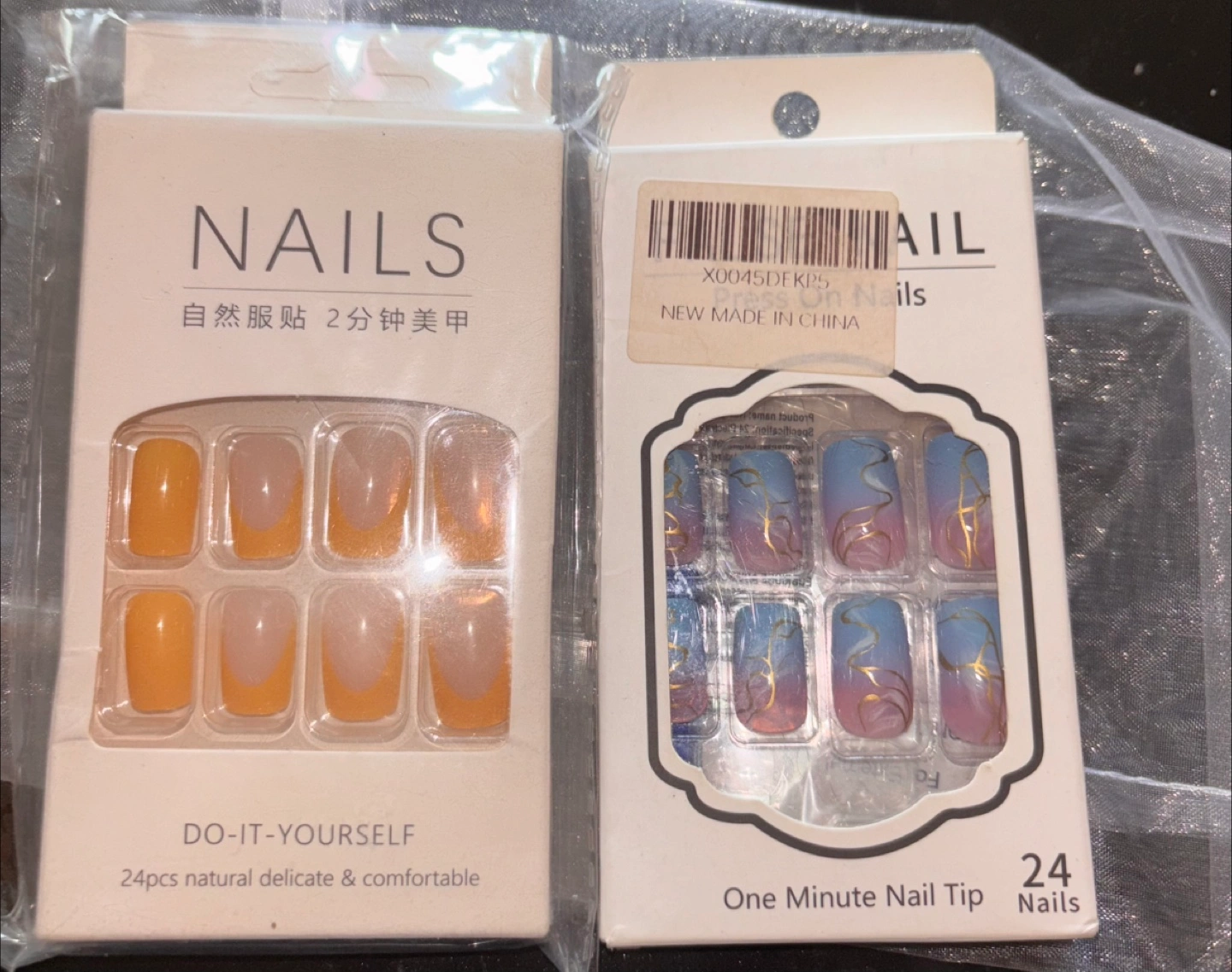 I'm selling two sets of press on nails. One set has a yellow french tip and the other has a blue to pink ombre design with gold accents. Both sets include 24 nails and are new in box!