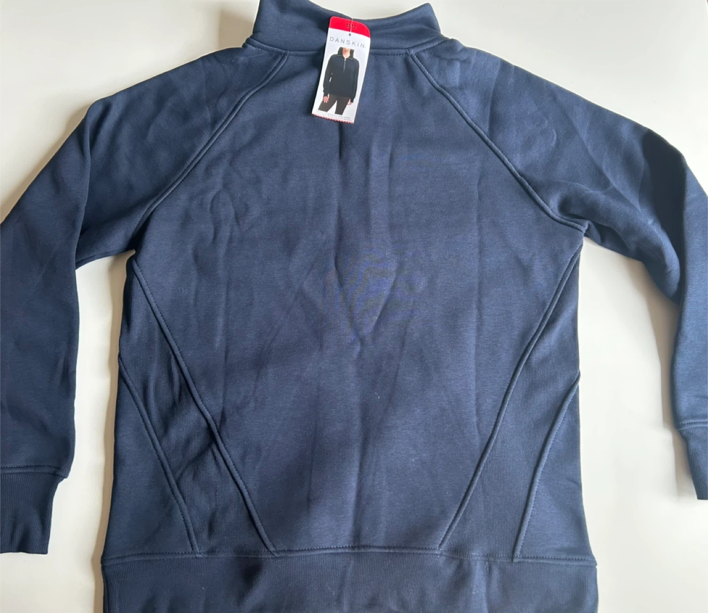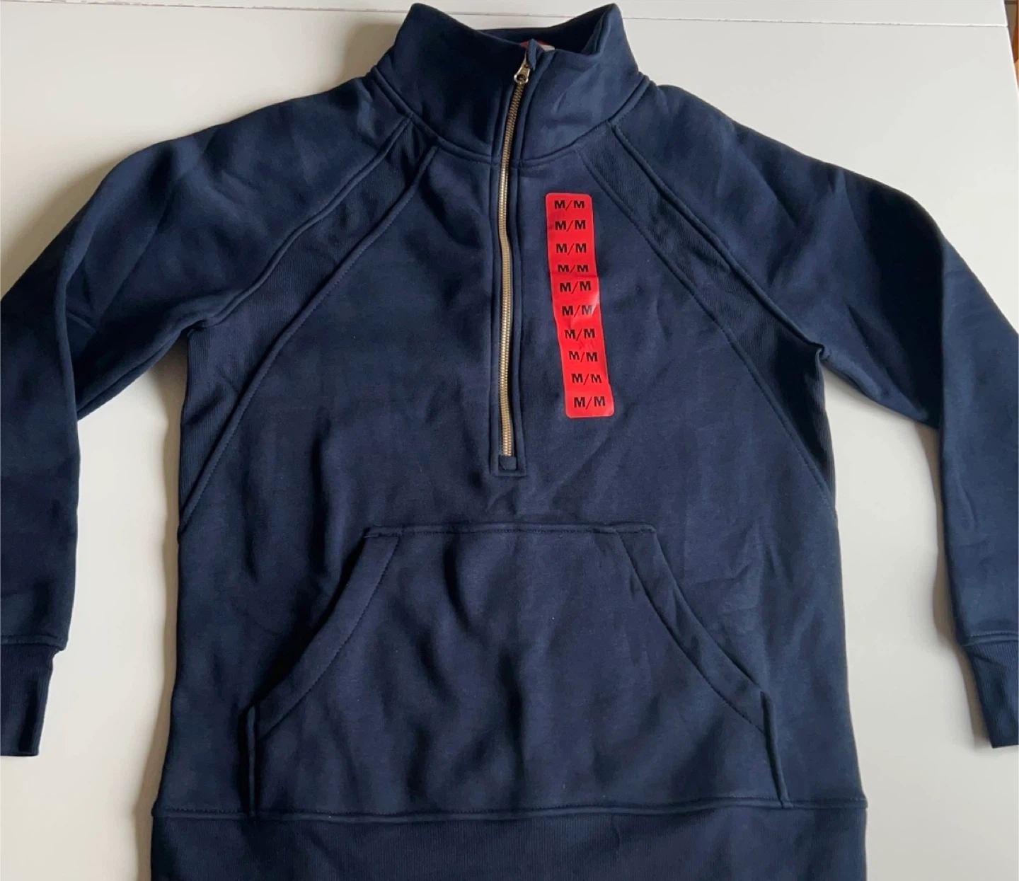 Comfortable navy blue quarter-zip sweatshirt with a front pocket. It's made of soft fabric and has ribbed cuffs and hem for a good fit. Great for casual wear!