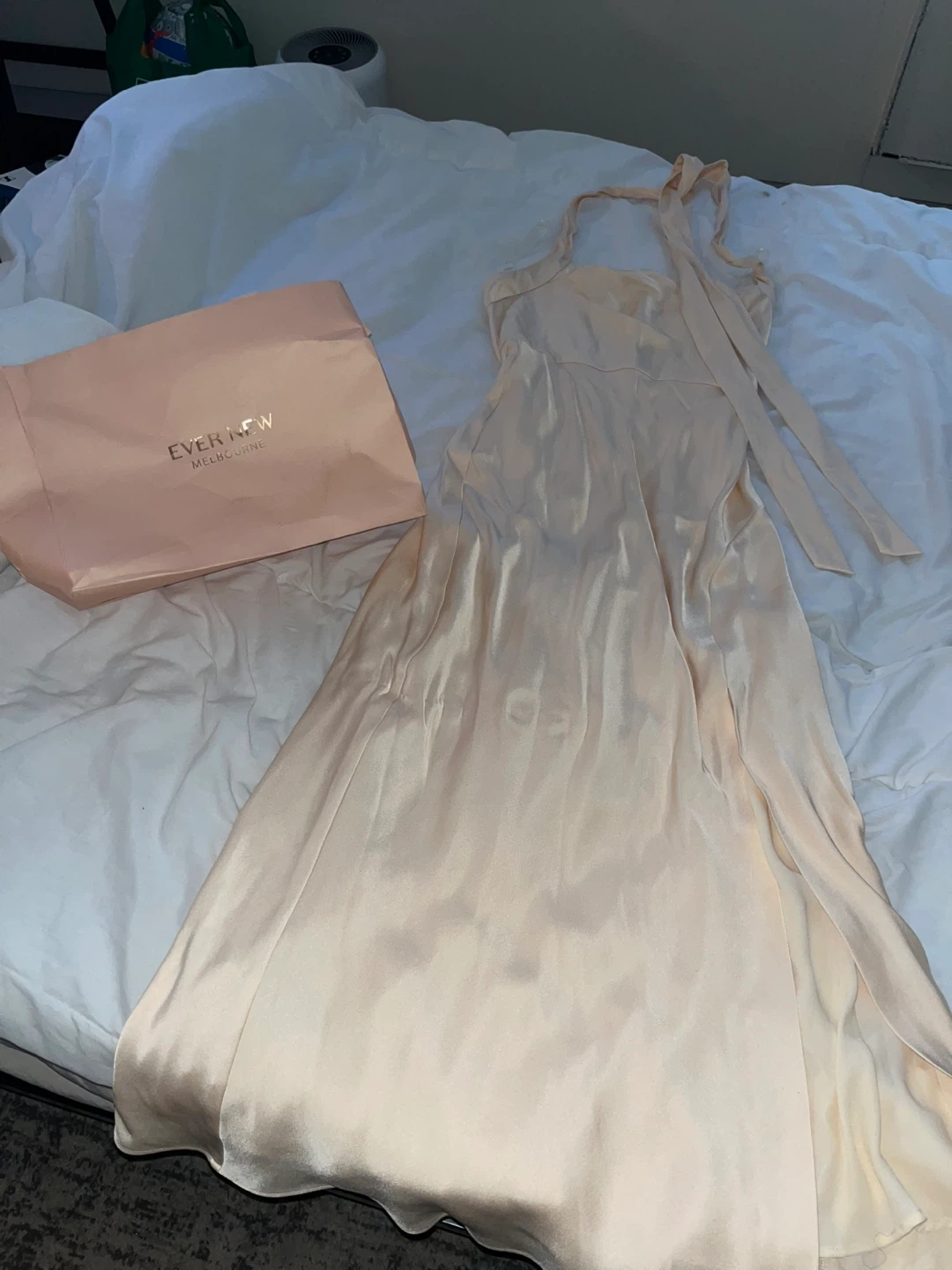 This is an Ever New satin maxi dress with a halter neckline. It features a high slit and a beautiful drape. Made in Vietnam. A lovely dress for a special occasion!