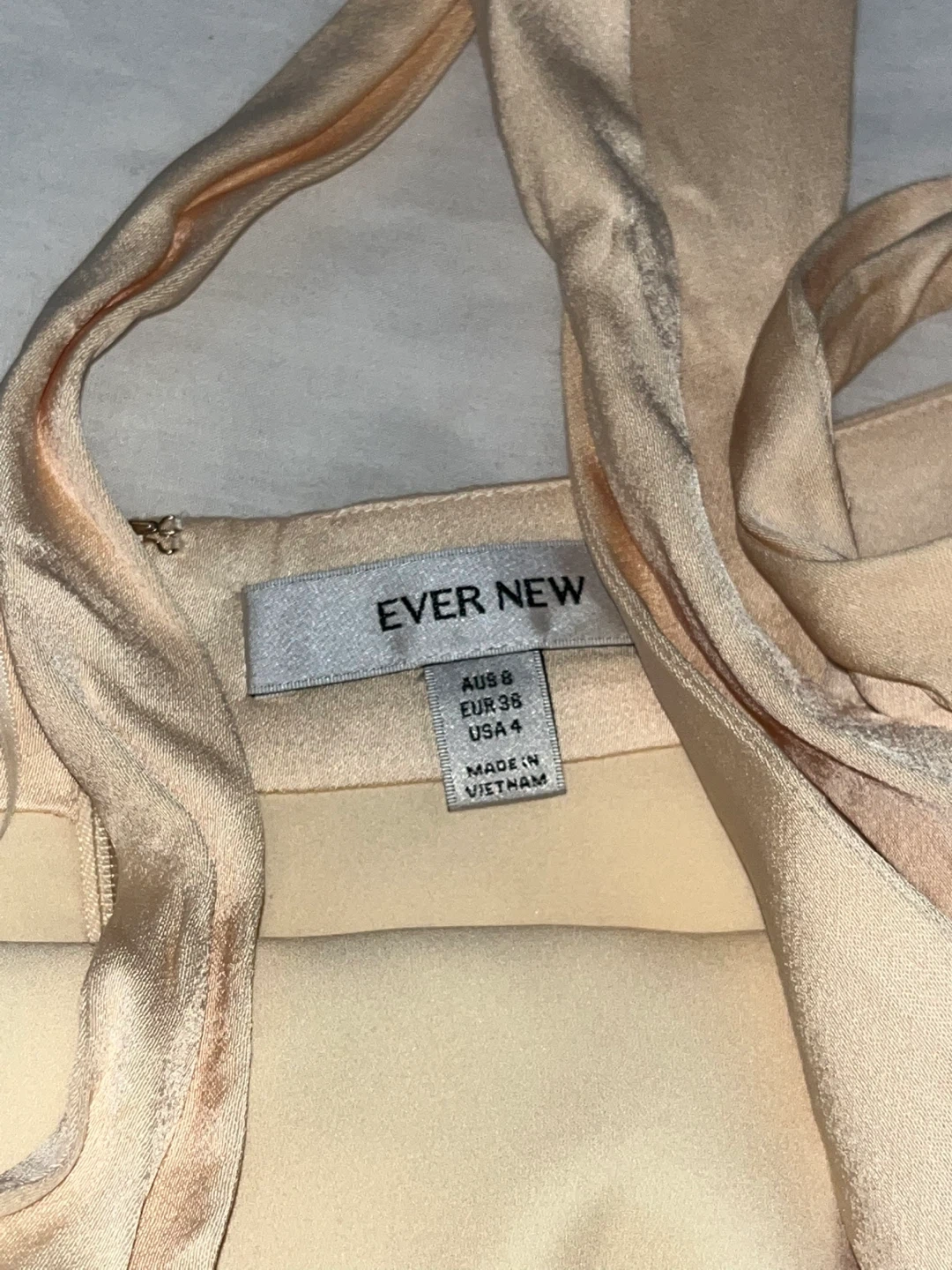 This is an Ever New satin maxi dress with a halter neckline. It features a high slit and a beautiful drape. Made in Vietnam. A lovely dress for a special occasion!