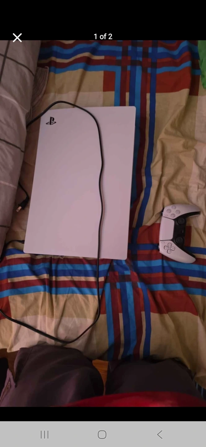 It's a white Sony PlayStation 5 console. It comes with a controller and necessary cables. This console is ready for gaming! Disc Edition