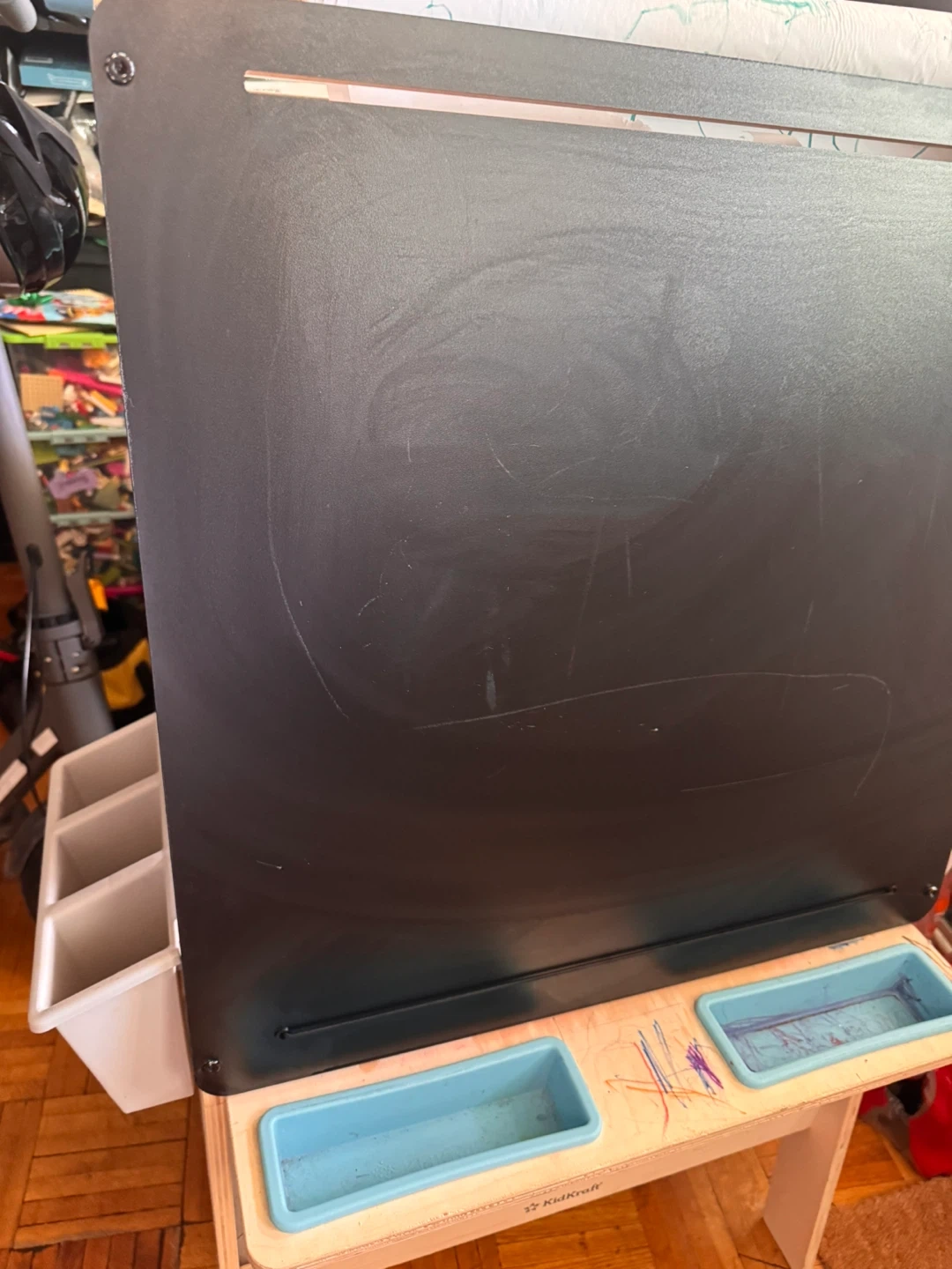 This KidKraft art easel provides a fun space for creative activities. It includes a chalkboard and a paper roll holder with paper. Storage bins are built-in for art supplies.