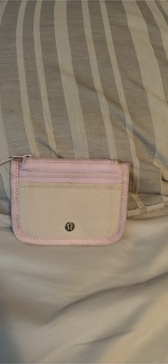 This is a Lululemon card holder pouch in pink and beige. It has a zippered compartment and exterior card slots. It's suitable for carrying cards and small essentials.