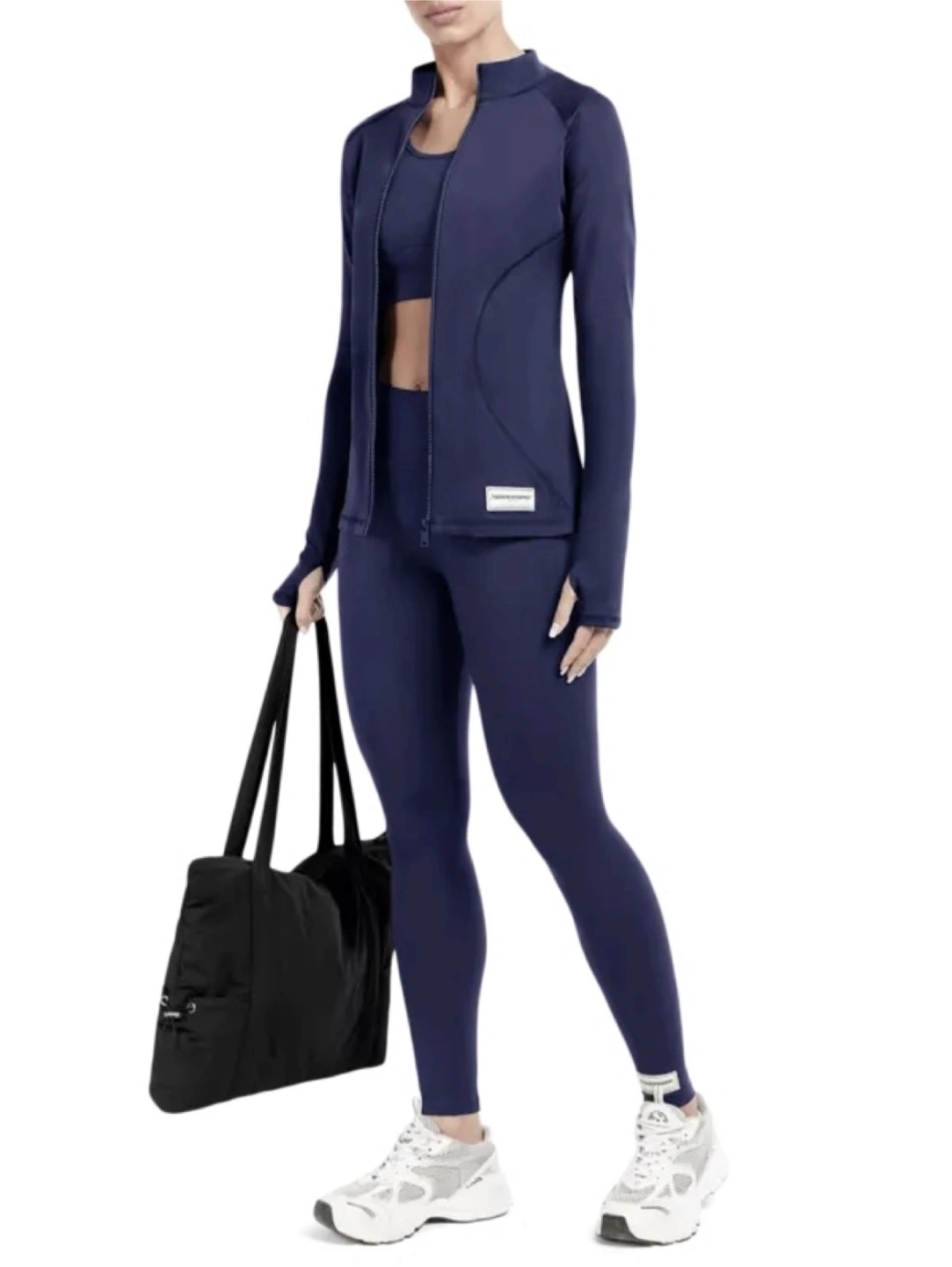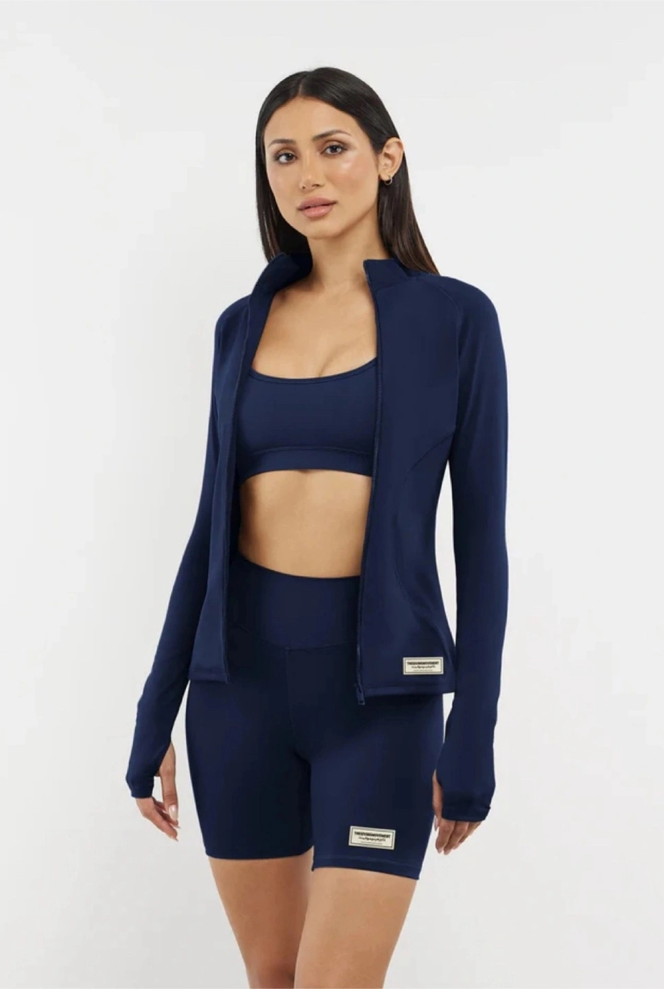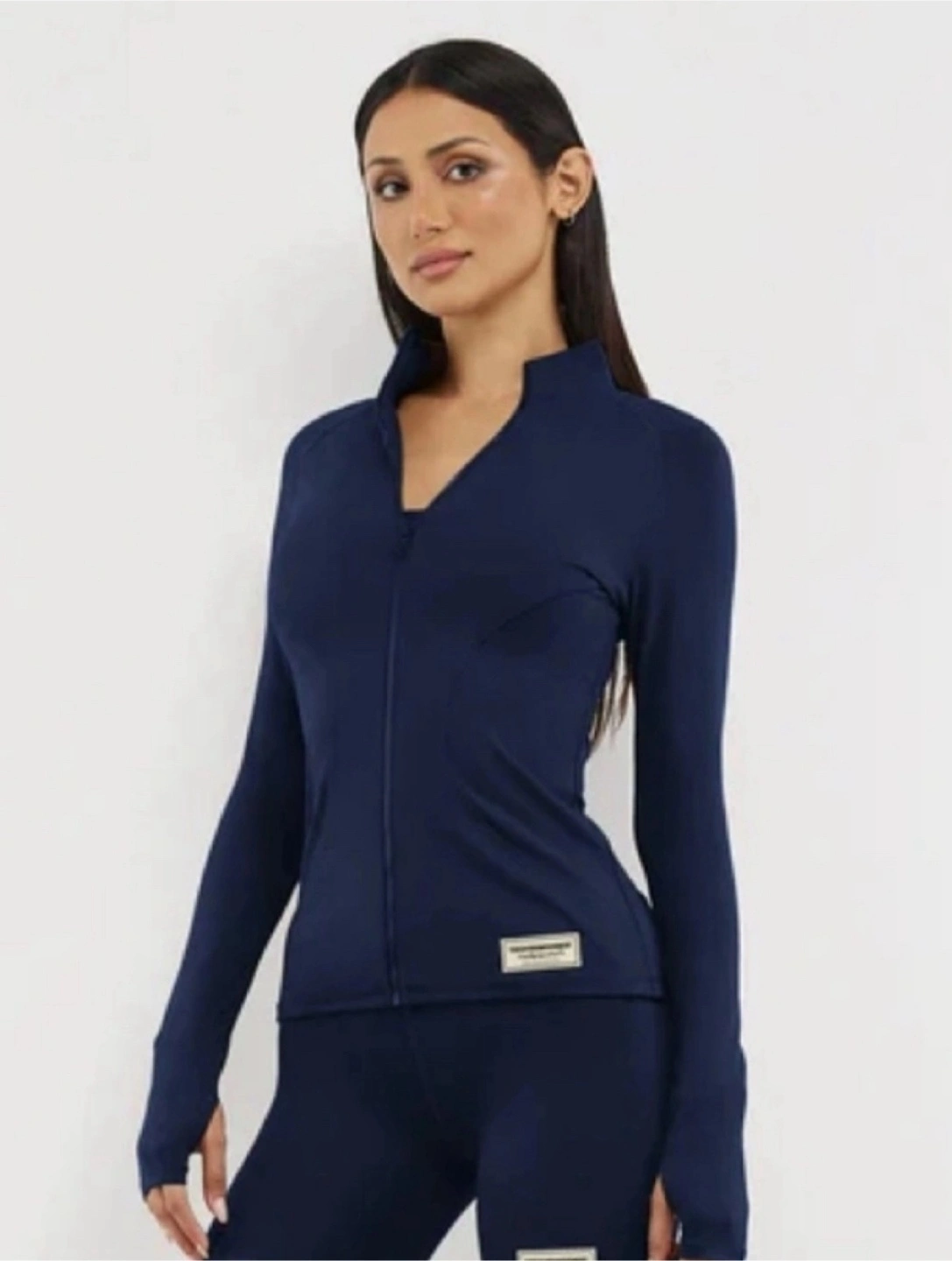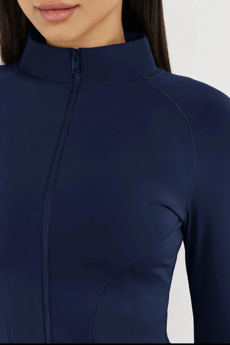 The jacket has a front zip fastening, a mock collar, and thumb cut-outs. With top-stitched lines that follow your body’s natural shape and crafted from lightweight, breathable fabric, this jacket is an ideal addition to elevate your athleisure looks.
