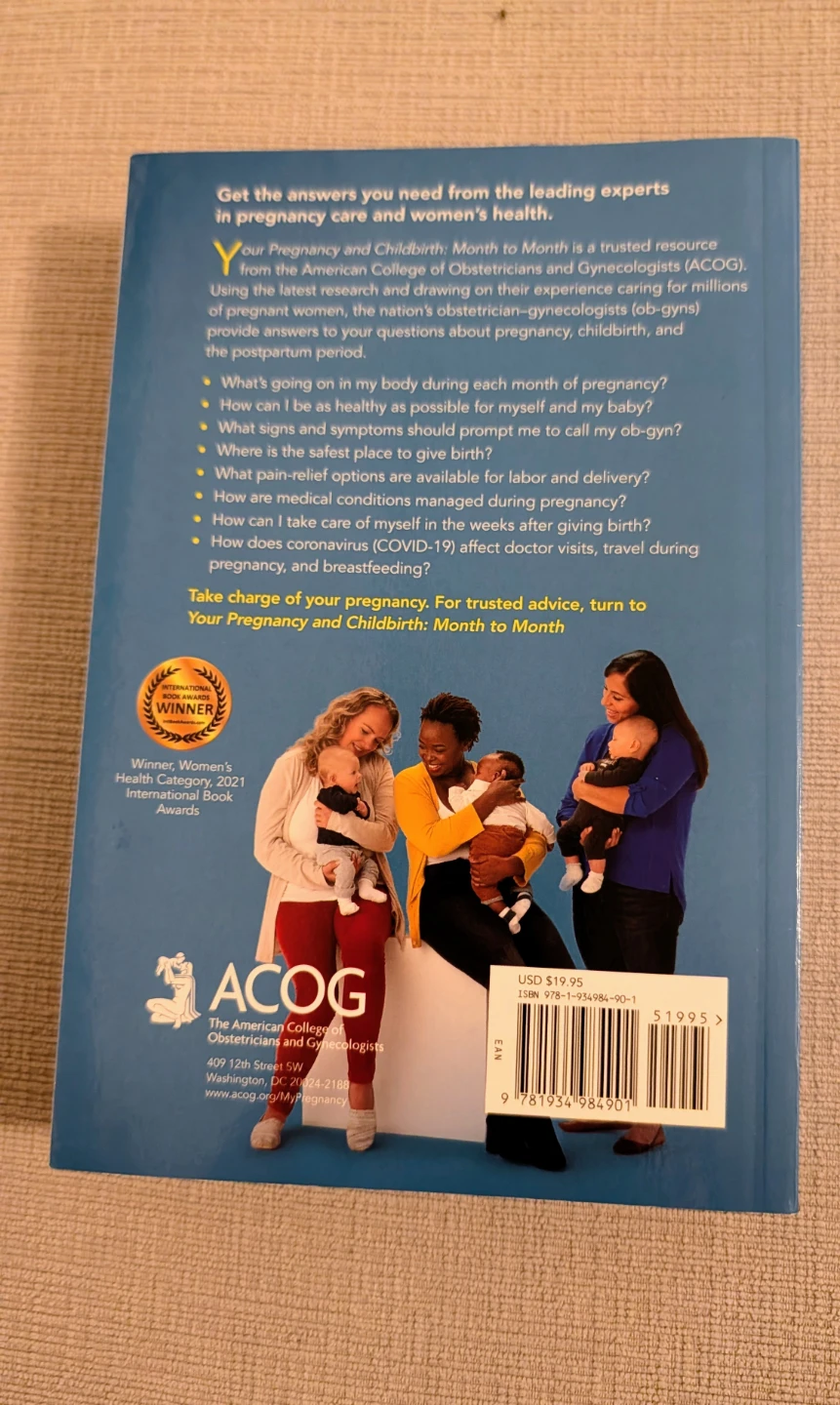 Your Pregnancy and Childbirth: Month to Month is a trusted resource from the American College of Obstetricians and Gynecologists (ACOG). It provides answers to your questions about pregnancy, childbirth, and the postpartum period. This seventh edition covers what's going on in your body each month and addresses common concerns.