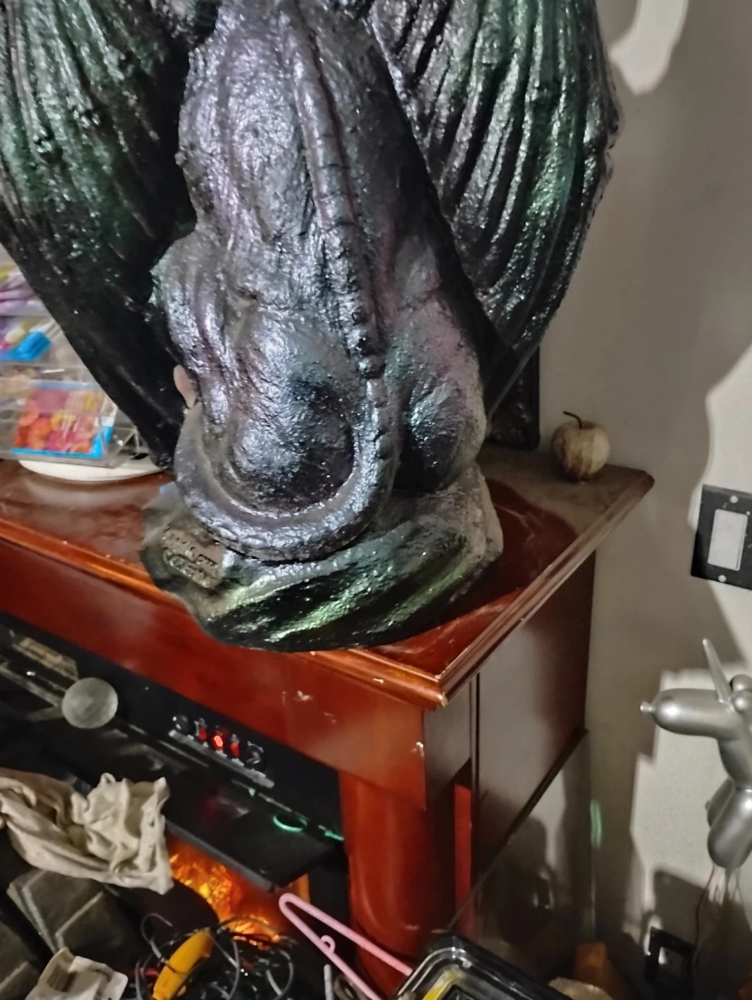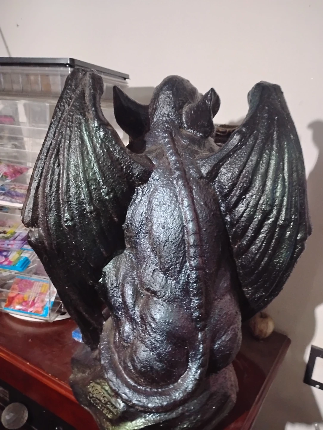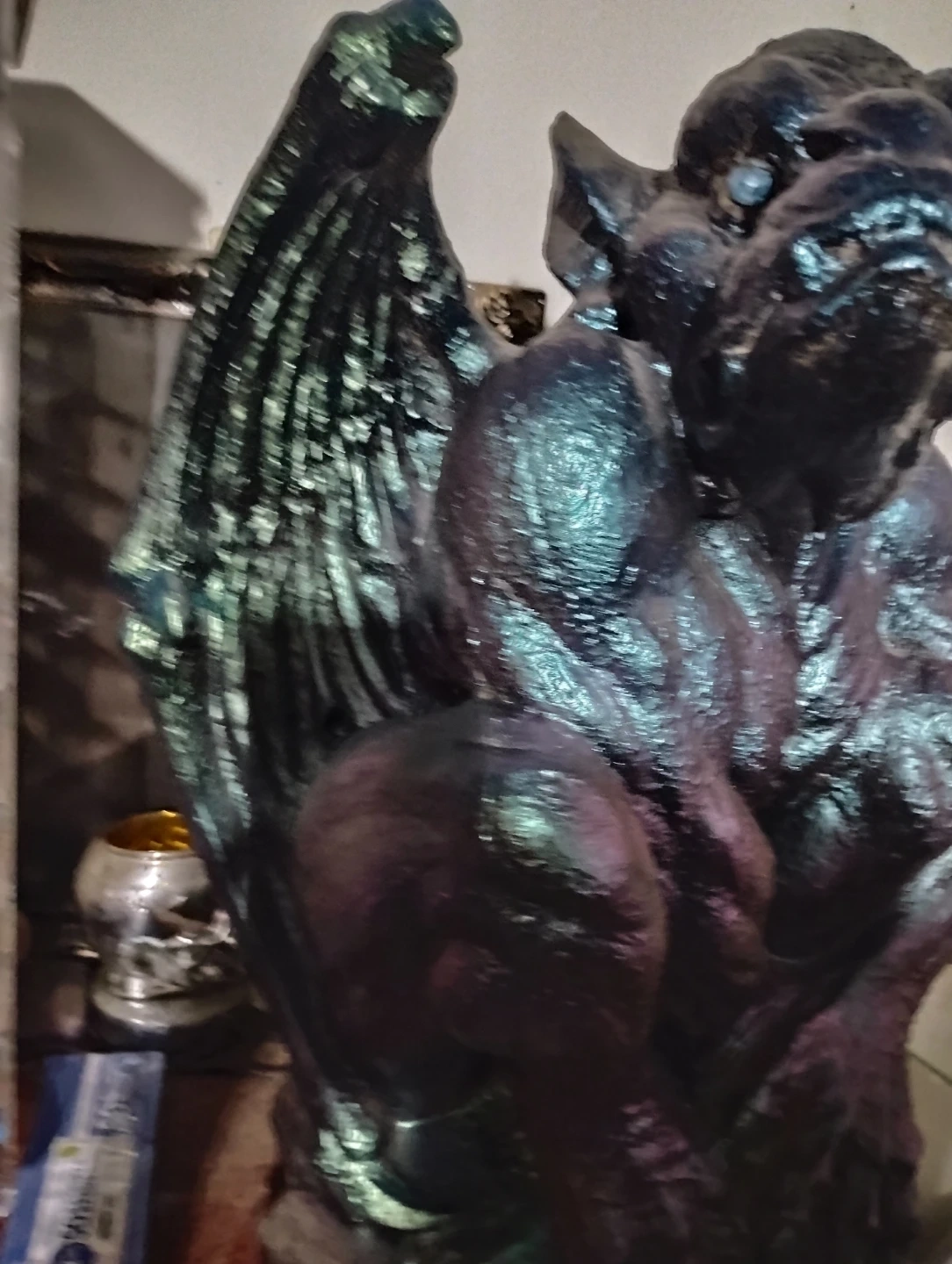 Dark, iridescent gargoyle statue. This detailed figure features wings and a menacing expression. Its unique colour finish makes it stand out. Adds a spooky or gothic touch to any space!
