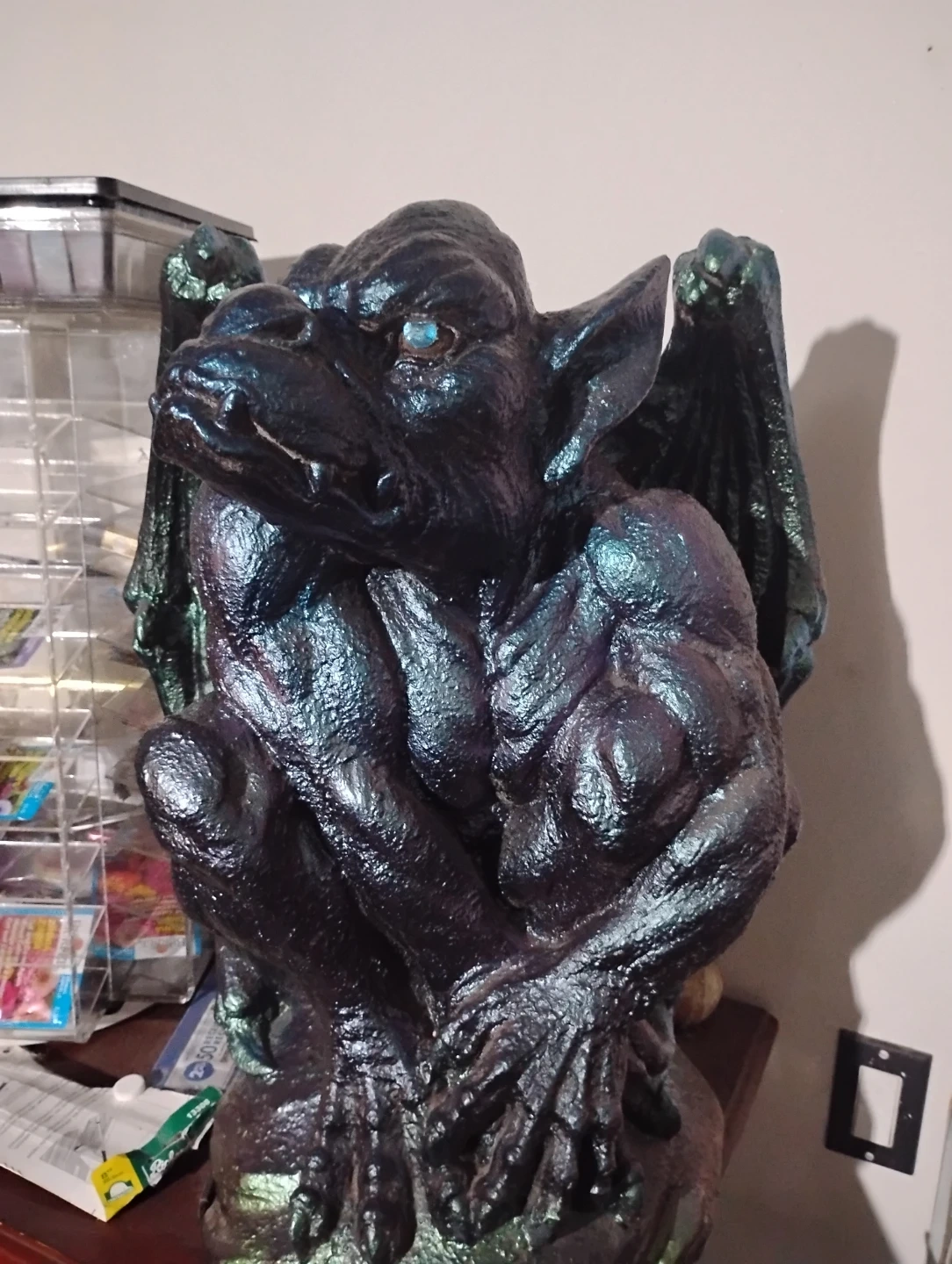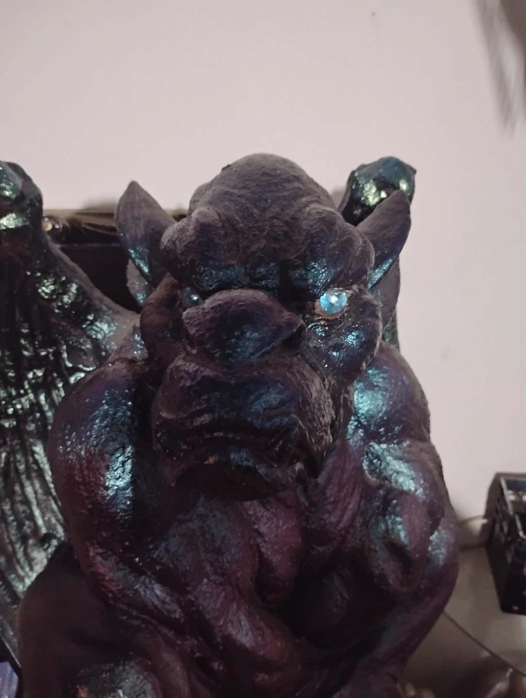 Dark, iridescent gargoyle statue. This detailed figure features wings and a menacing expression. Its unique colour finish makes it stand out. Adds a spooky or gothic touch to any space!