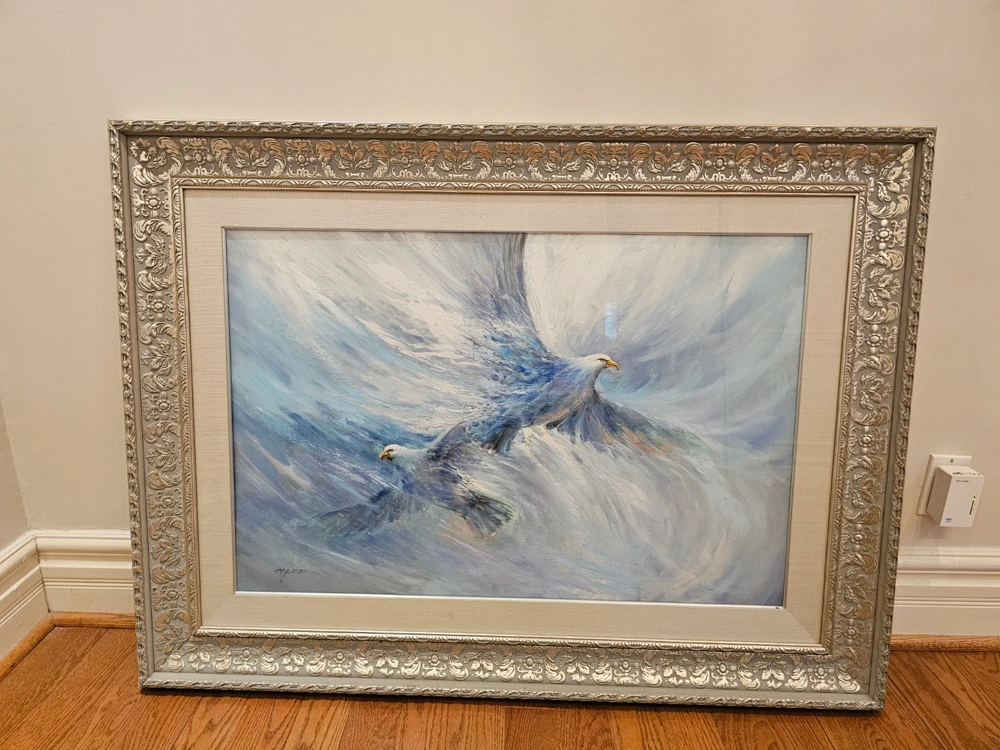 A framed painting featuring two seagulls in flight against a dynamic, abstract background of blues and whites. It's presented in an ornate, silver-toned frame. This artwork would add a touch of coastal charm to any room.