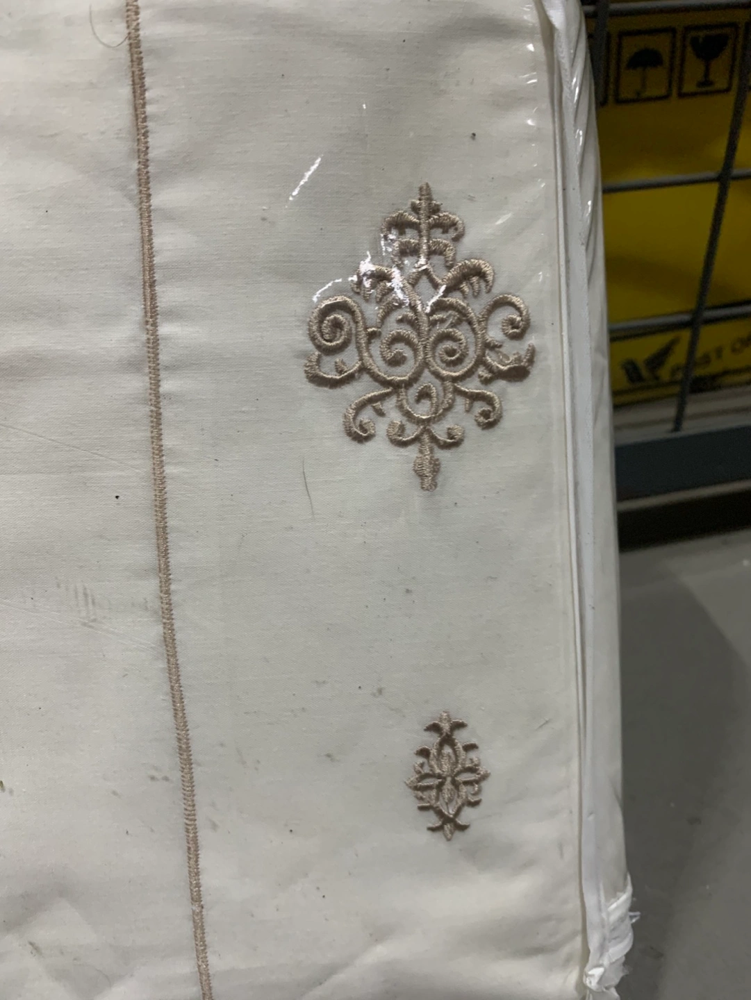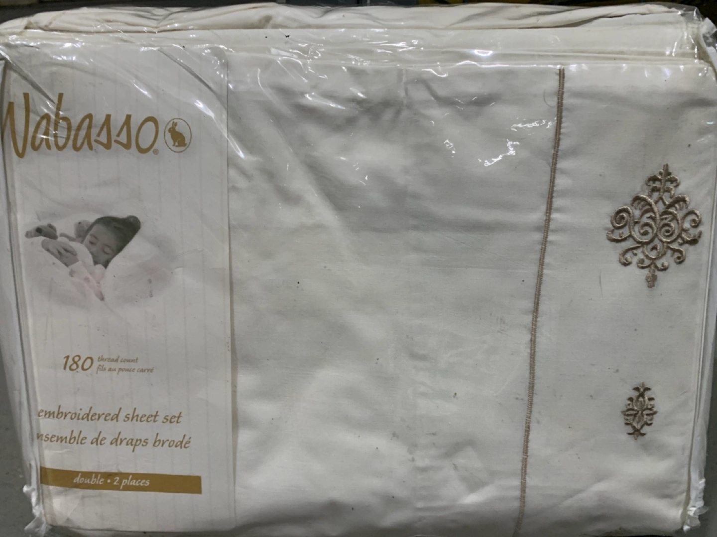 Double sheet set, 180 thread count. Includes flat sheet, fitted sheet, and two pillowcases. 50% cotton, 50% polyester. Fits up to a 14 in. mattress.