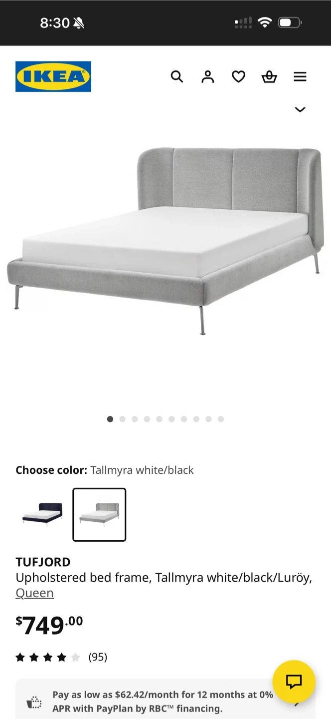 Upholstered queen bed frame featuring a modern design with a tall, segmented headboard. It's upholstered in a neutral grey fabric. The frame is sturdy and includes a mattress support system. This bed would be a great addition to any bedroom! Queen