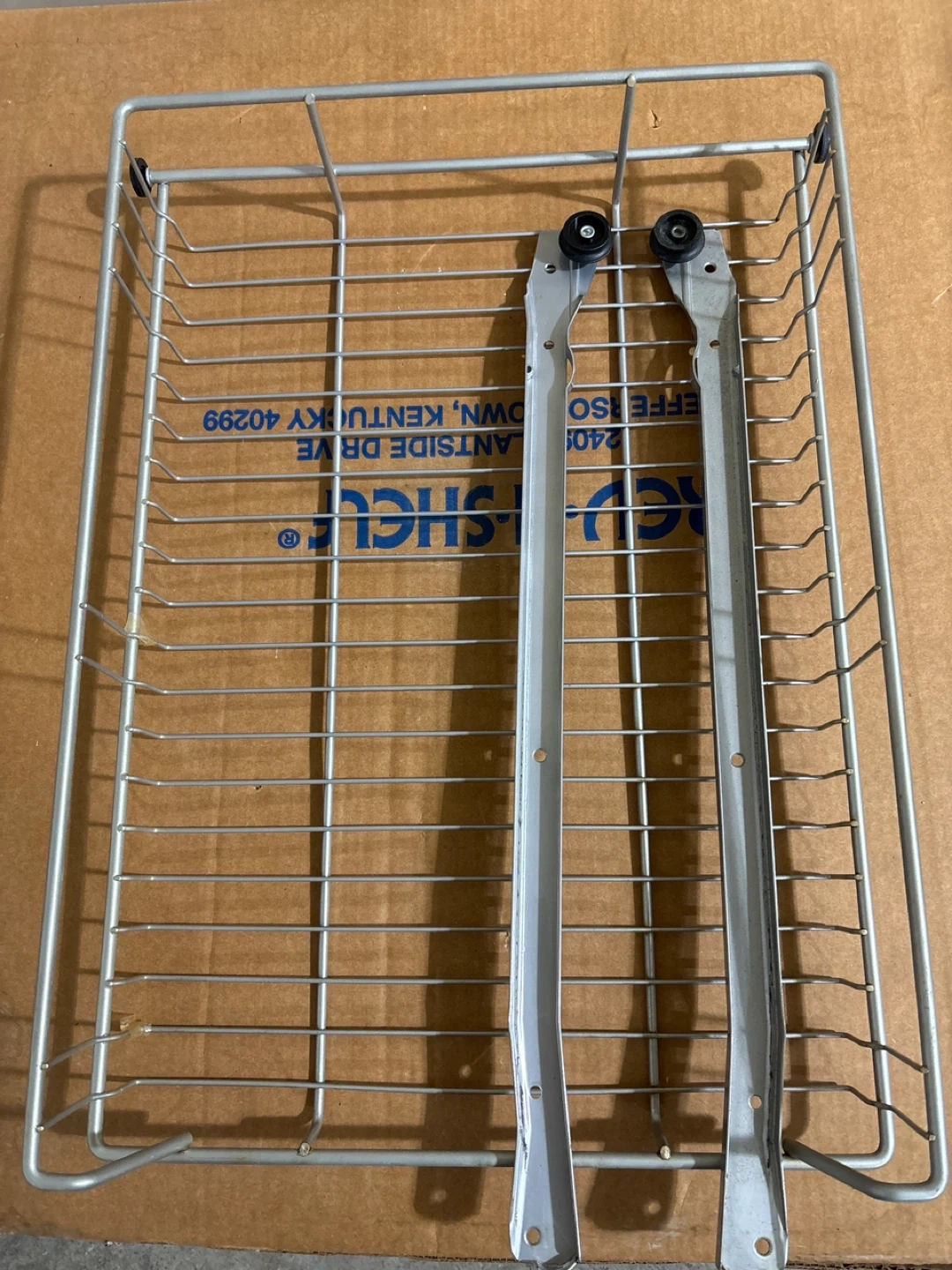 Selling a silver wire basket, perfect for adding extra storage to your home. It comes with the metal slides, so it's ready to install. Great for organizing your kitchen, pantry, or bathroom