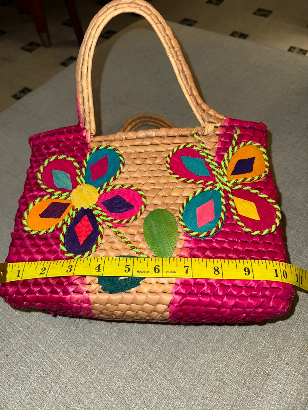 This charming Handcrafted Palm Handbag Purse features colorful floral embroidery. It's accented with bright pink yarn details. Approximately 10 inches wide and 7 inches tall. with Unique Flower Designs | Eco-Friendly and Stylish Handmade