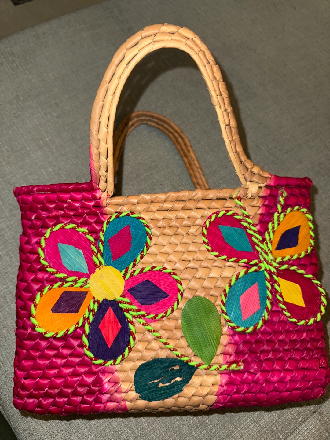 This charming Handcrafted Palm Handbag Purse features colorful floral embroidery. It's accented with bright pink yarn details. Approximately 10 inches wide and 7 inches tall. with Unique Flower Designs | Eco-Friendly and Stylish Handmade
