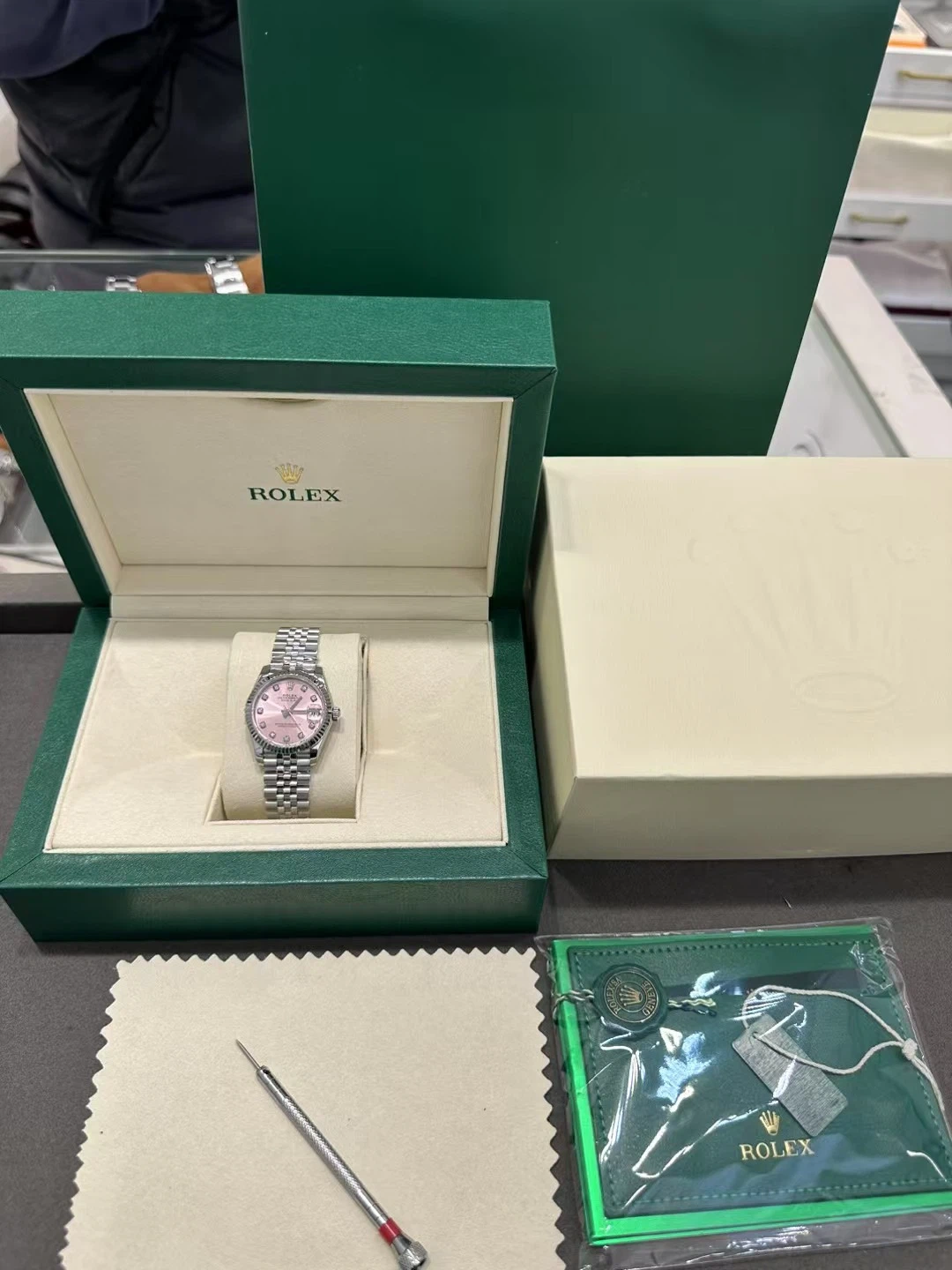 Authentic Rolex watch with a pink dial and diamond markers. It includes the original box, papers, and polishing cloth. This watch features a stainless steel Jubilee bracelet and automatic movement.
