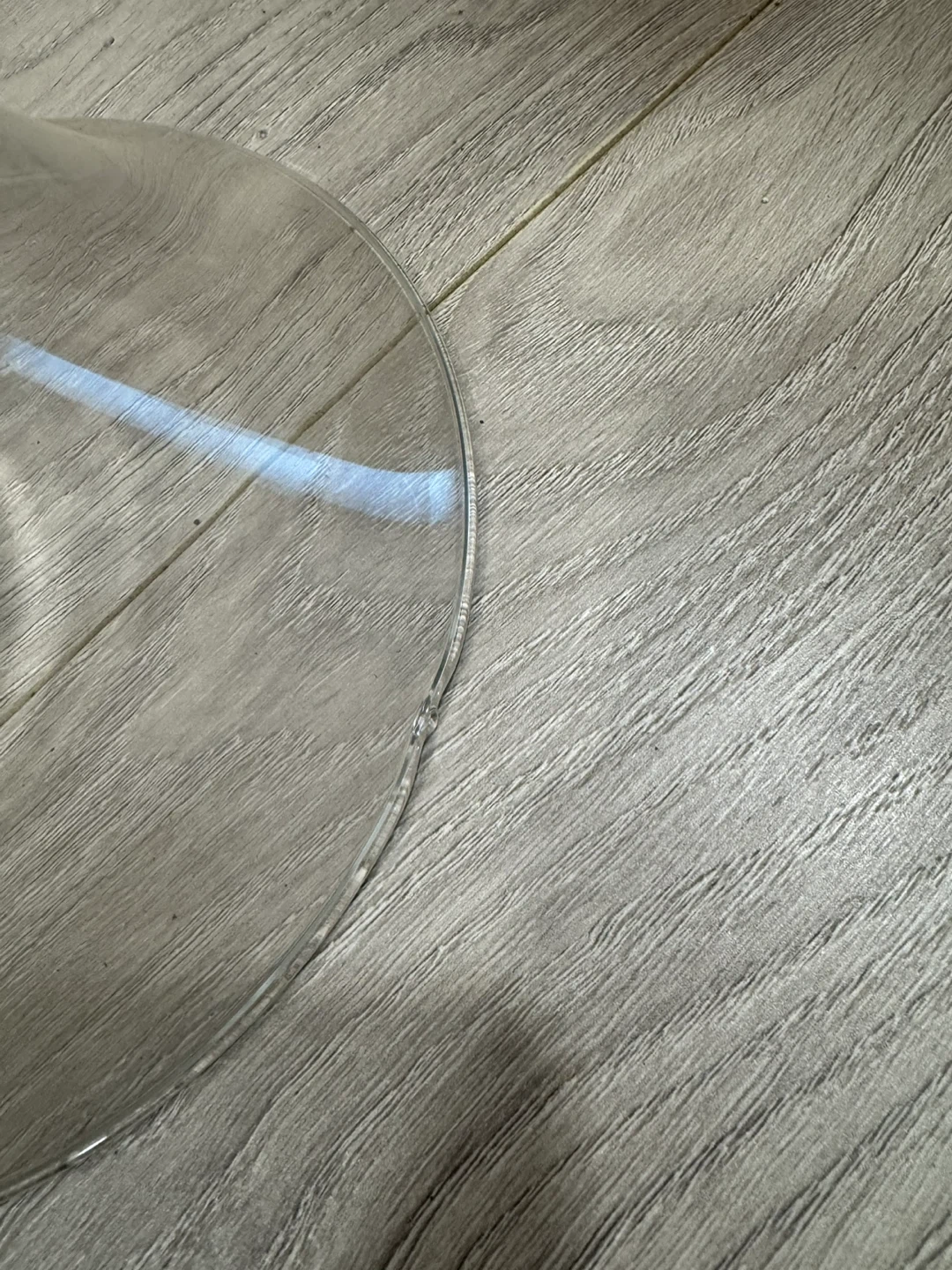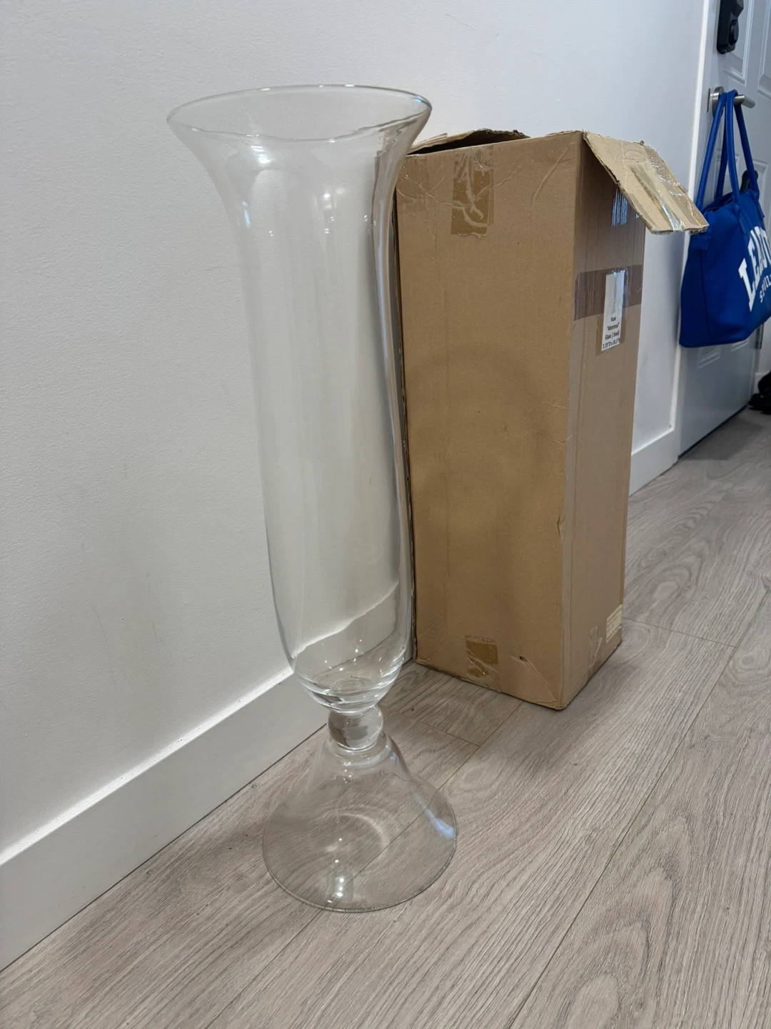 This is a glass vase called "Montreal". It's made of clear glass. The dimensions are 7.75" in diameter and 26.5" in height. It includes its original box.