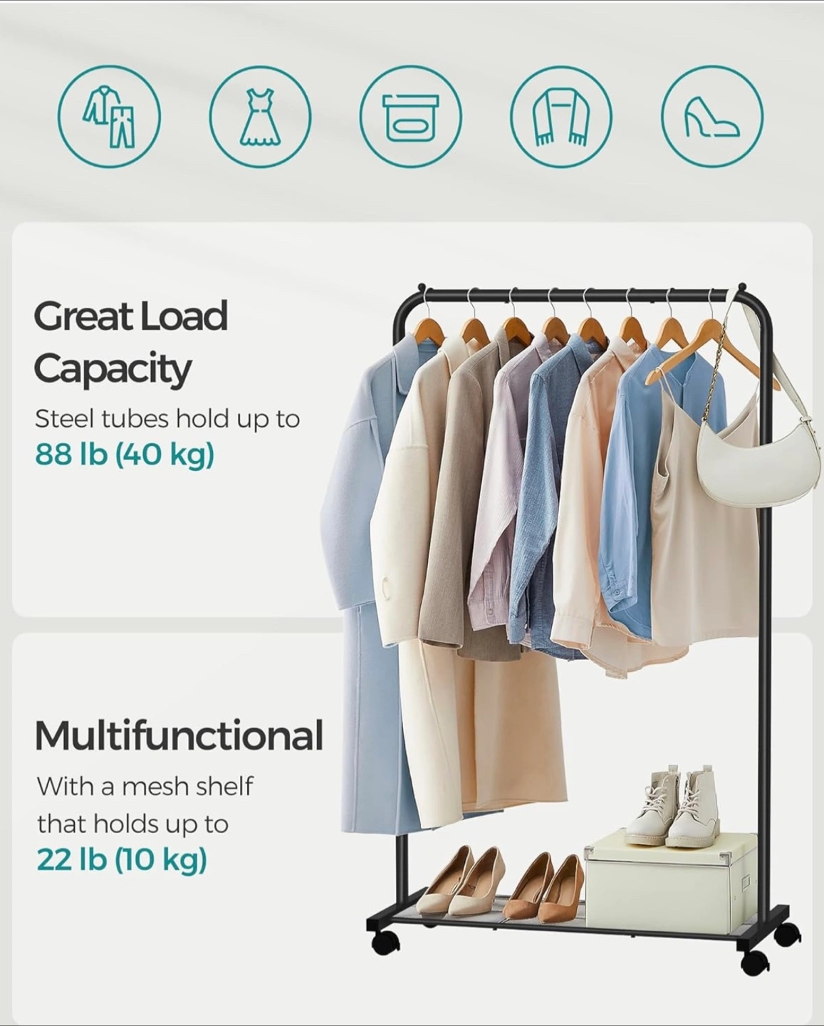 I'm selling this rolling garment rack. It features a top hanging bar and a mesh shelf below. The rack has four wheels for easy mobility. You can use it to organize your closet or create a small dressing area; it is a great item to purchase to help you feel more relaxed.