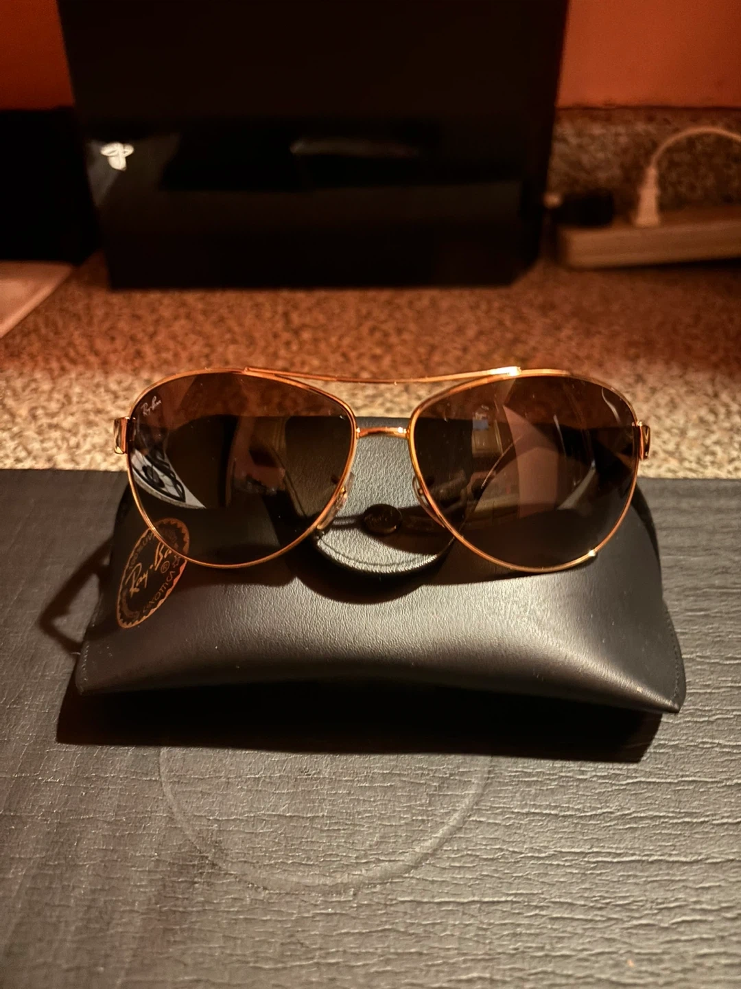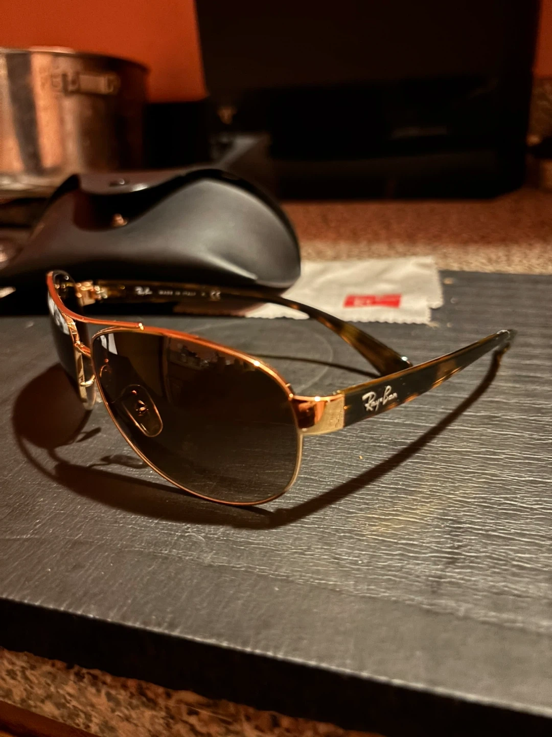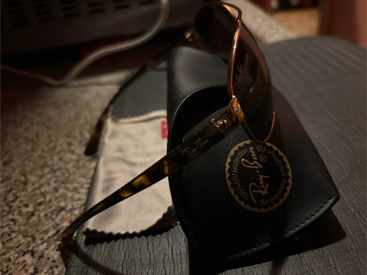 These Ray-Ban sunglasses feature a classic aviator style with a rose gold frame and brown gradient lenses. They offer 100% UV protection. Includes the original Ray-Ban protective case and cleaning cloth. Made in Italy.