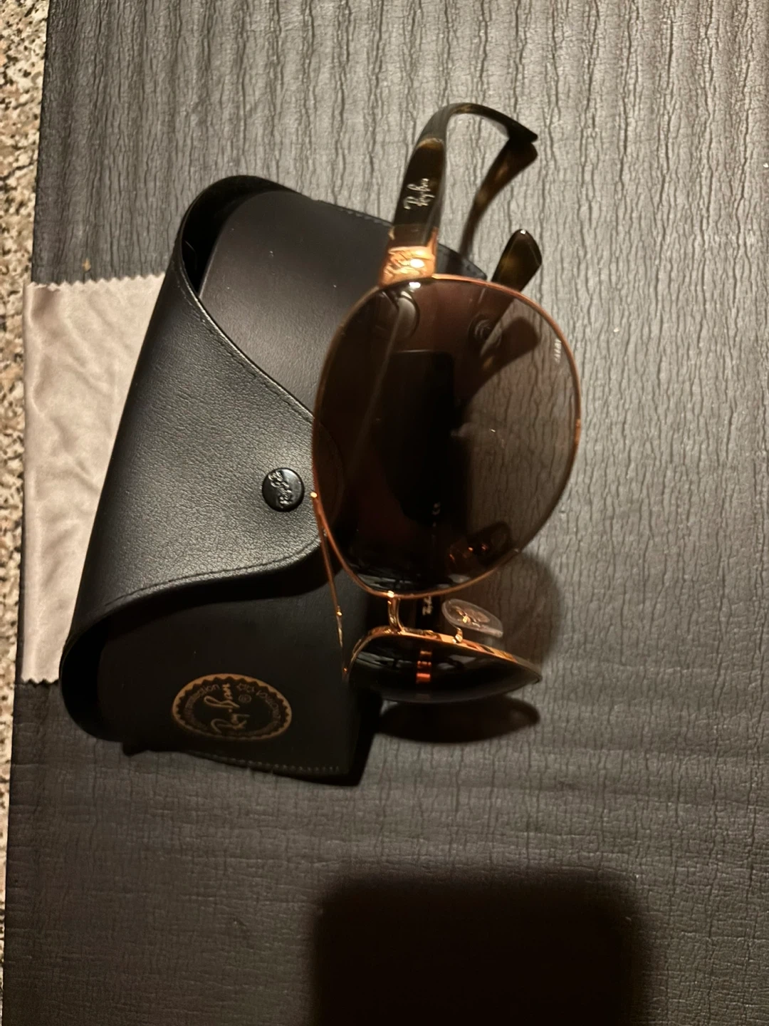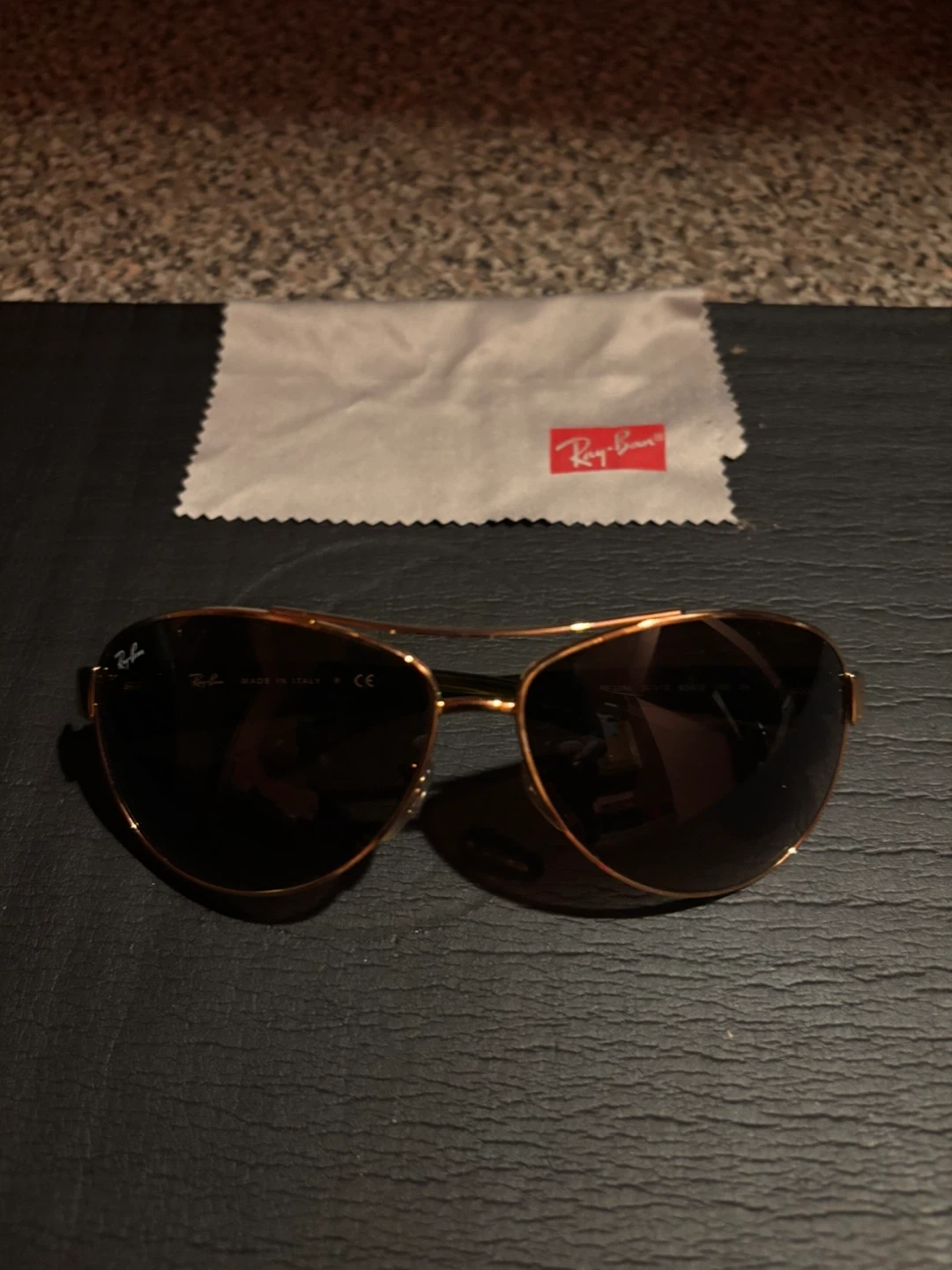 These Ray-Ban sunglasses feature a classic aviator style with a rose gold frame and brown gradient lenses. They offer 100% UV protection. Includes the original Ray-Ban protective case and cleaning cloth. Made in Italy.